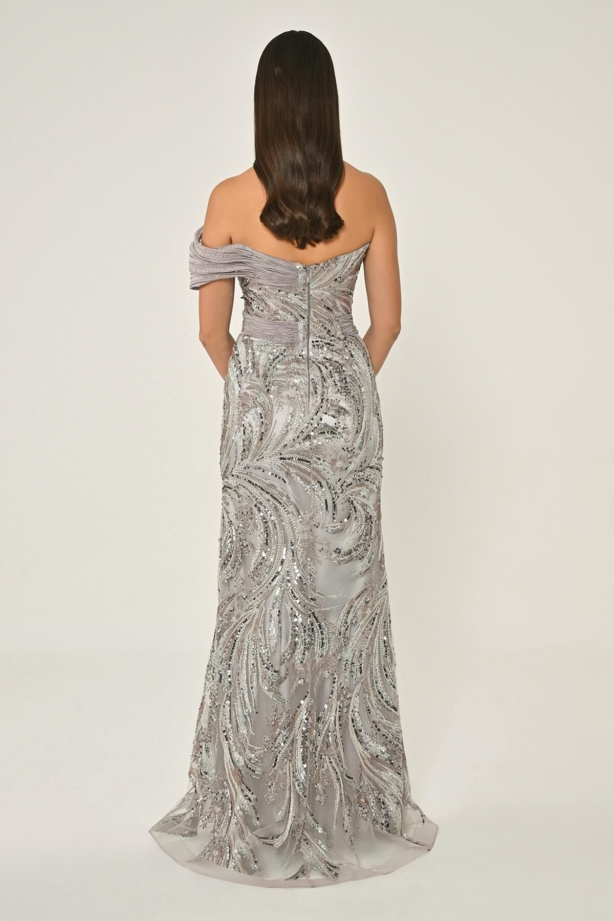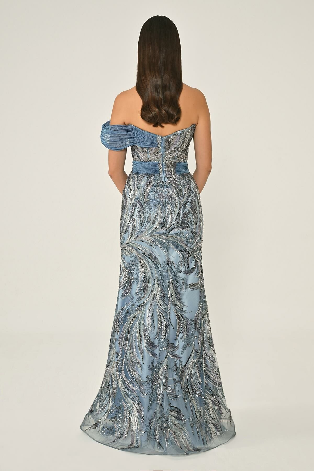 فستان سهرة طويل من ألفا بيتا ون، مكشوف الكتفين، بفتحة جانبية، مزين بالترتر