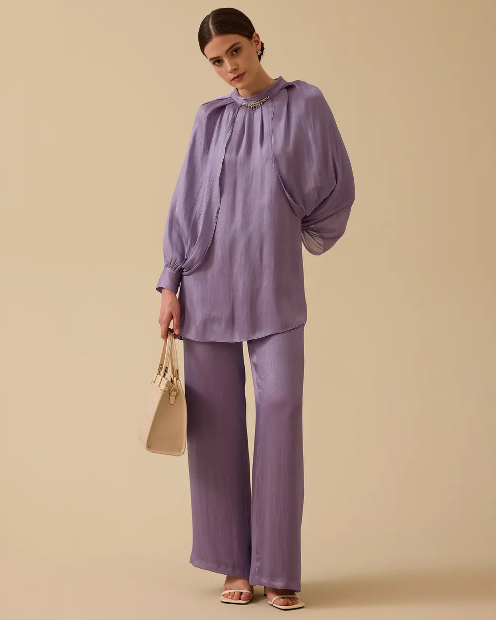 تُبرز هذه السترة الفضفاضة ذات الأكمام الواسعة أناقتك بتصميمها الأنيق ذي الأكمام الفضفاضة وقصتها الانسيابية . كما أن تصميمها المريح ومظهرها العصري يجعلانها خيارًا أنيقًا للارتداء اليومي والمناسبات الخاصة على حد سواء.