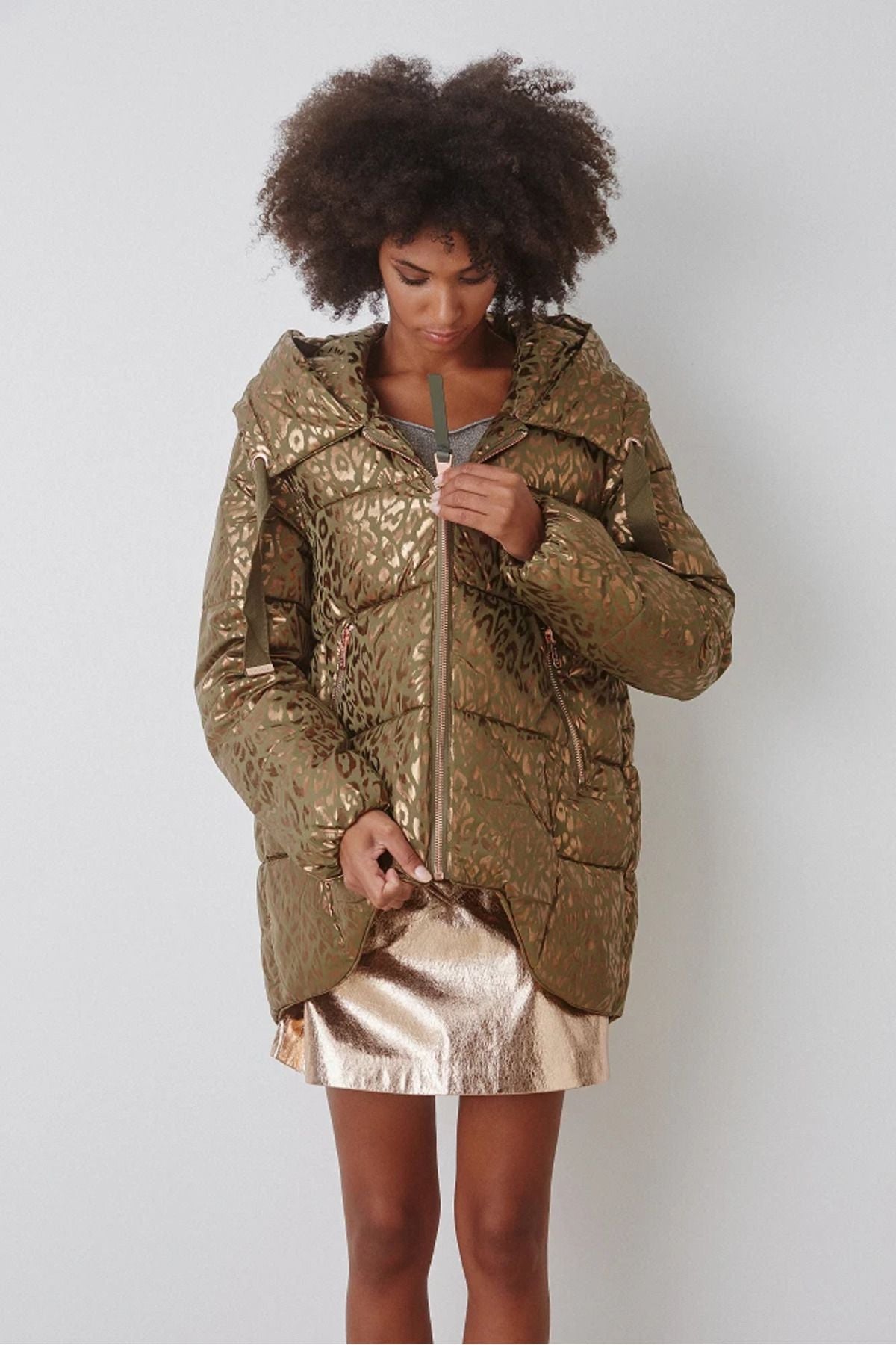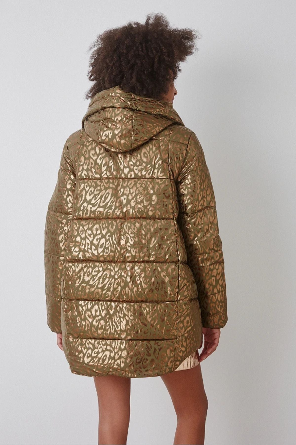 تفاصيل المنتج:؛ جاكيت منفوخ بنقشة جلد النمر المعدني، مزود بغطاء رأس، وجيوب جانبية، وإغلاق بأزرار أمامية، وحافة...