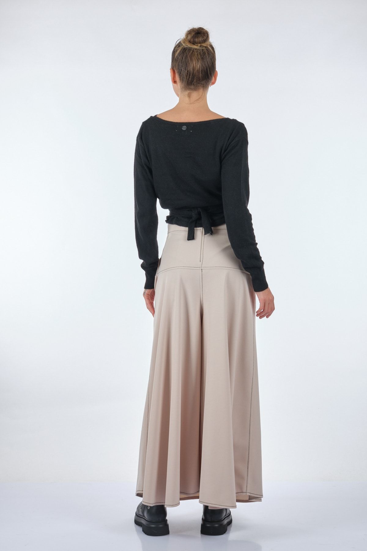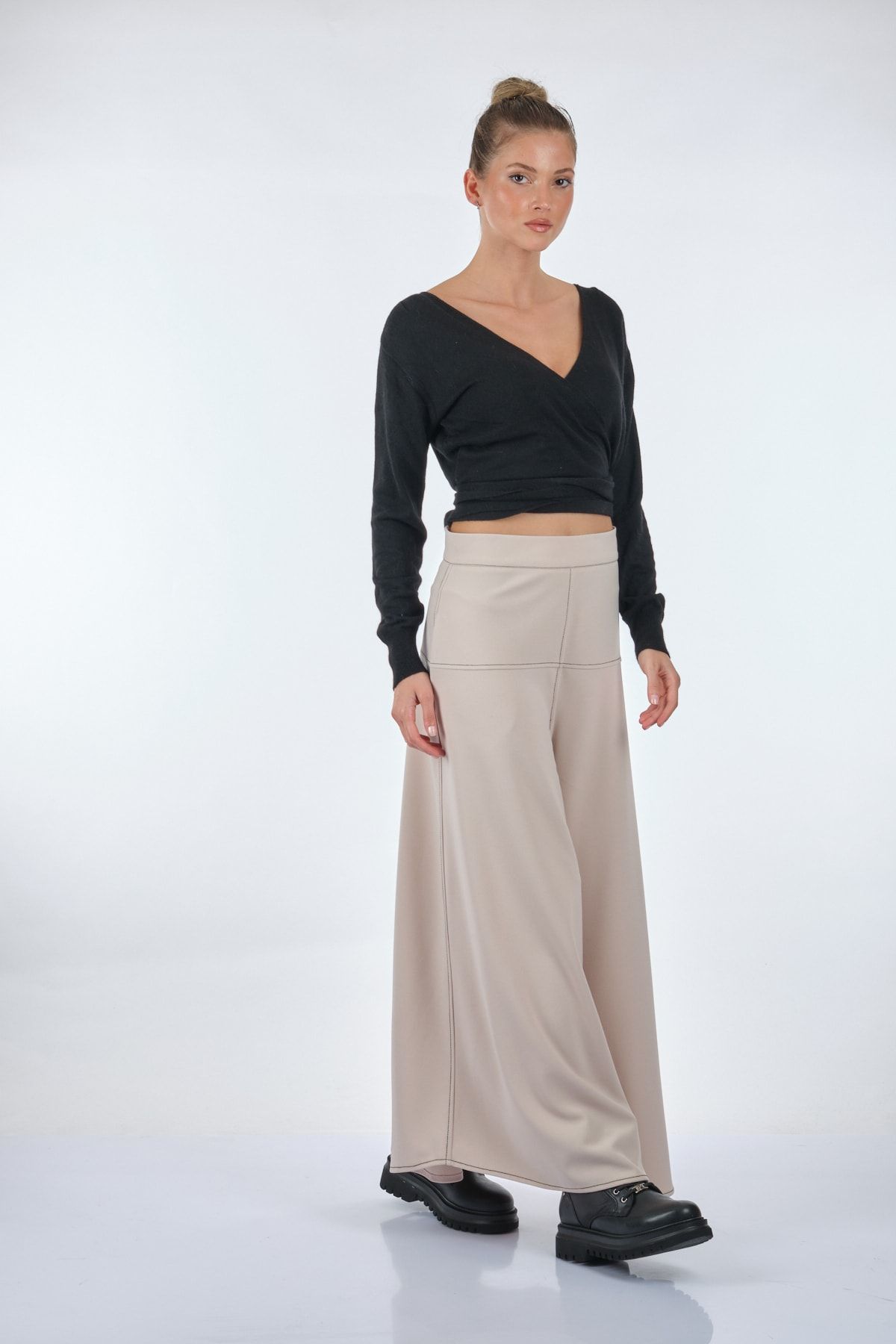 قياسات العارضة: الوزن: 52 كجم / الطول: 1.73 سم / الصدر: 86 سم / الخصر: 65 سم / الأرداف: 92 سم / المقاس: صغير تركيبة النسيج: 50% فيسكوز، 45% بولي أميد، 5% أنغورا
