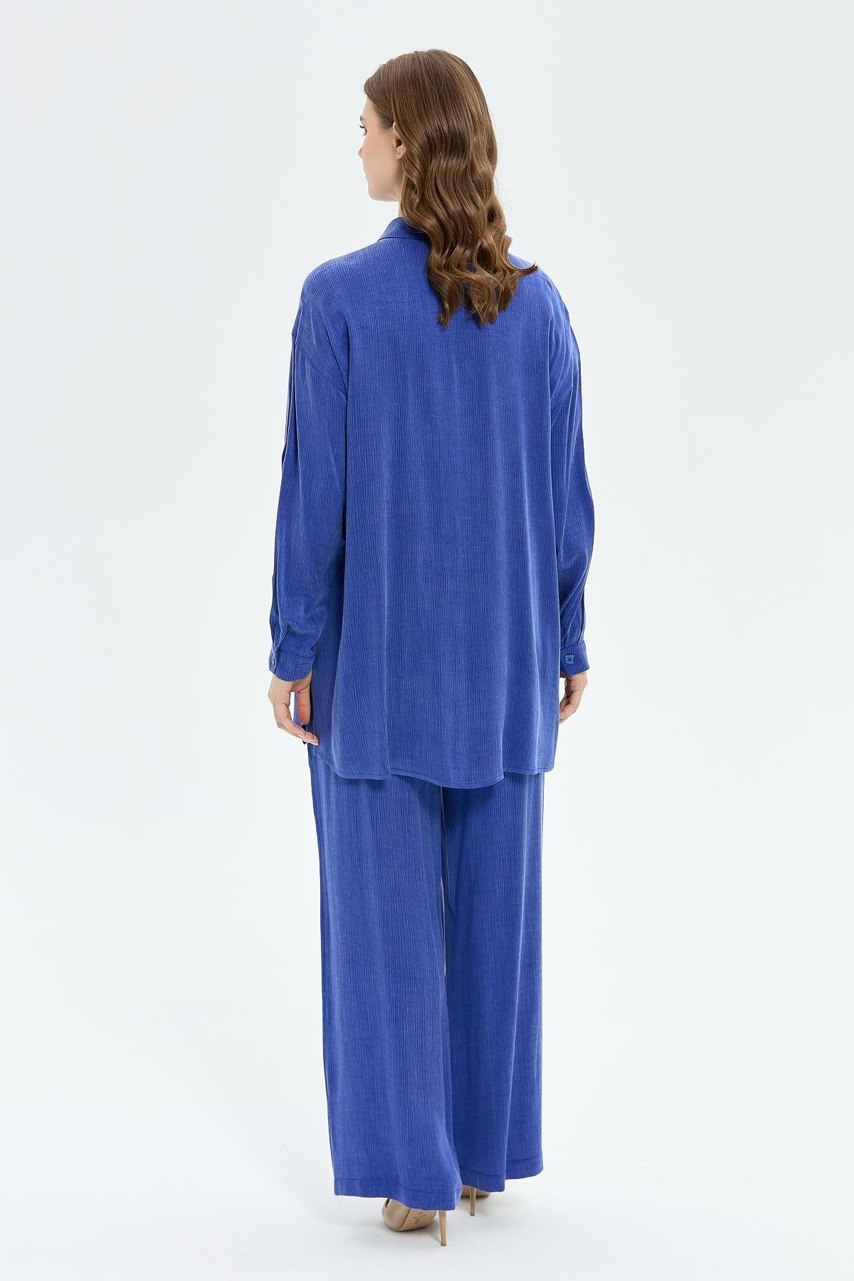 قماش حرير كوبرا منسوج. طقم بأزرار وبنطال بخصر مطاطي. قصة مريحة. طول القميص: ٨٥ سم. طول البنطال: ١٠٨ سم.
