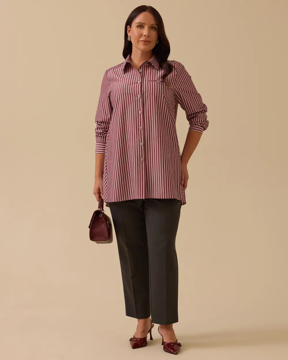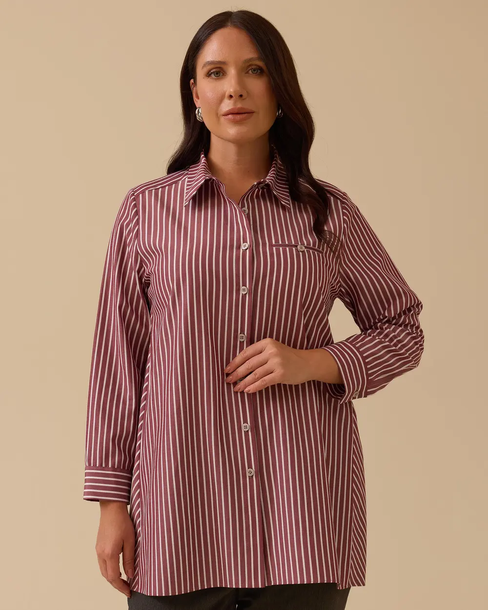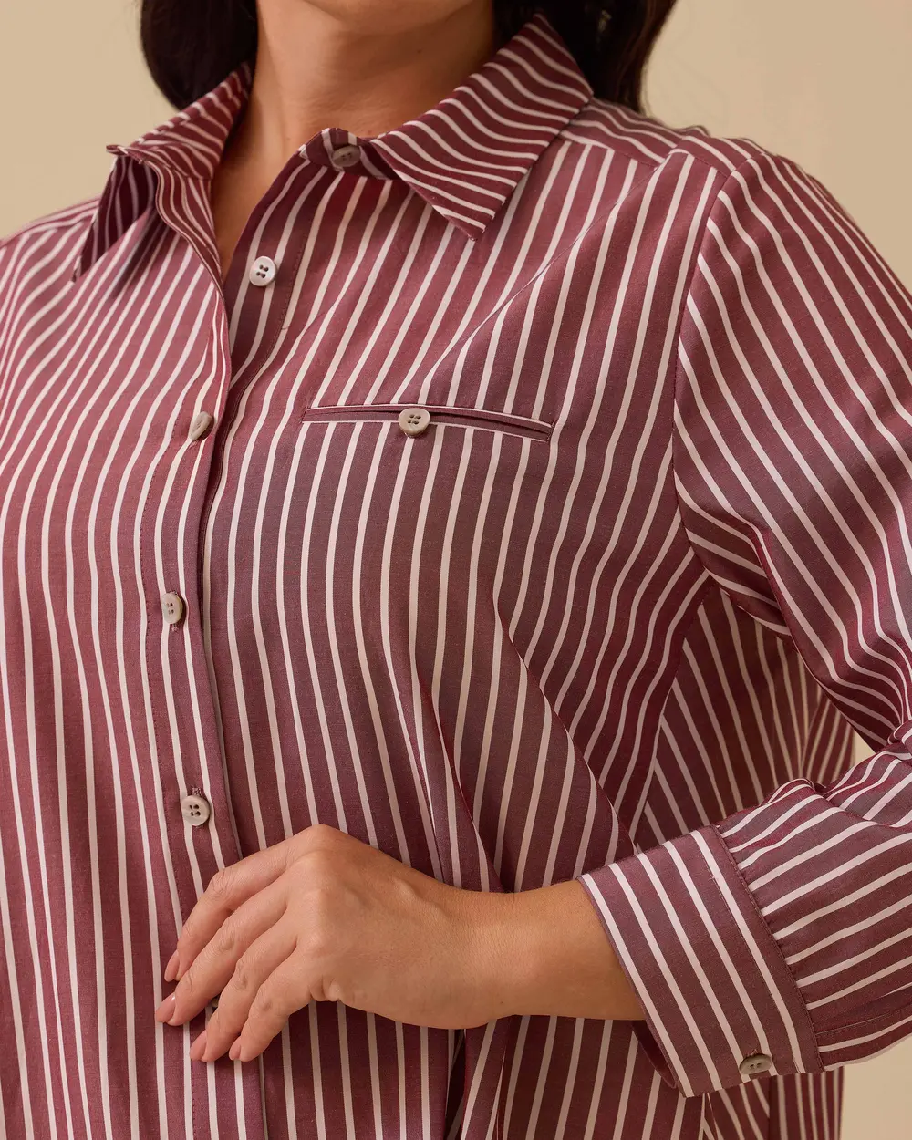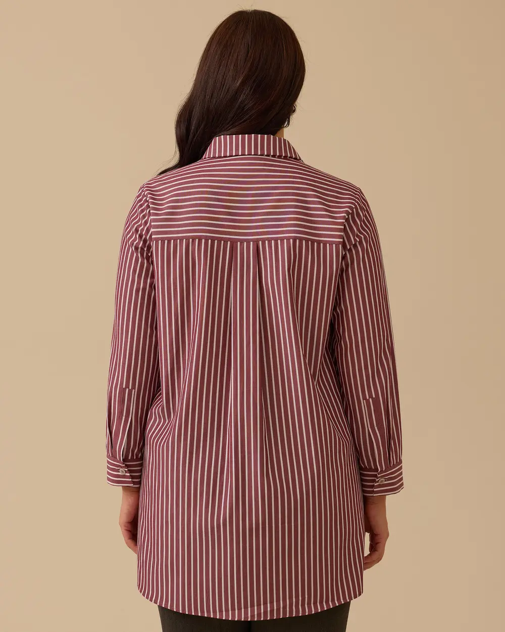 يُضفي هذا القميص المخطط ذو المقاسات الكبيرة لمسة عصرية على إطلالتك اليومية بفضل خطوطه الحديثة ومقاسه المريح.