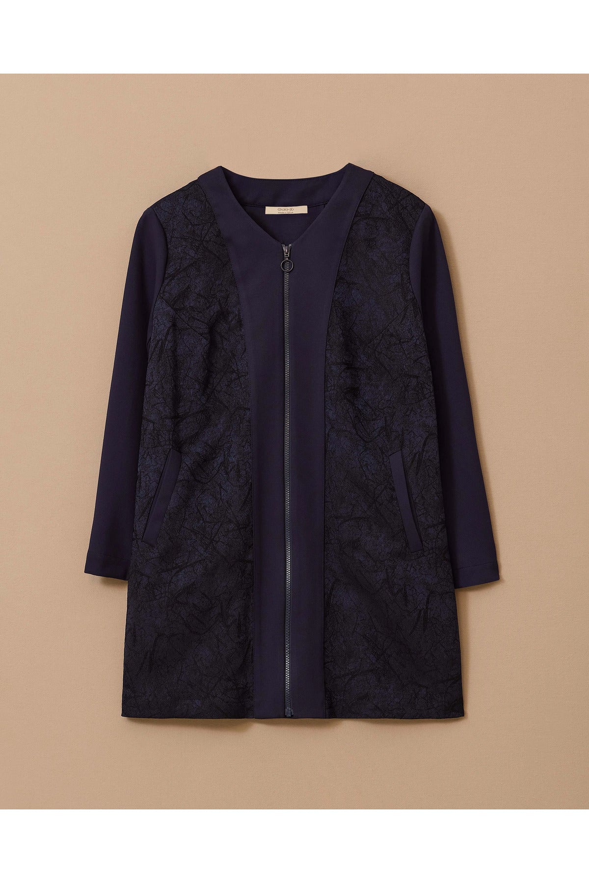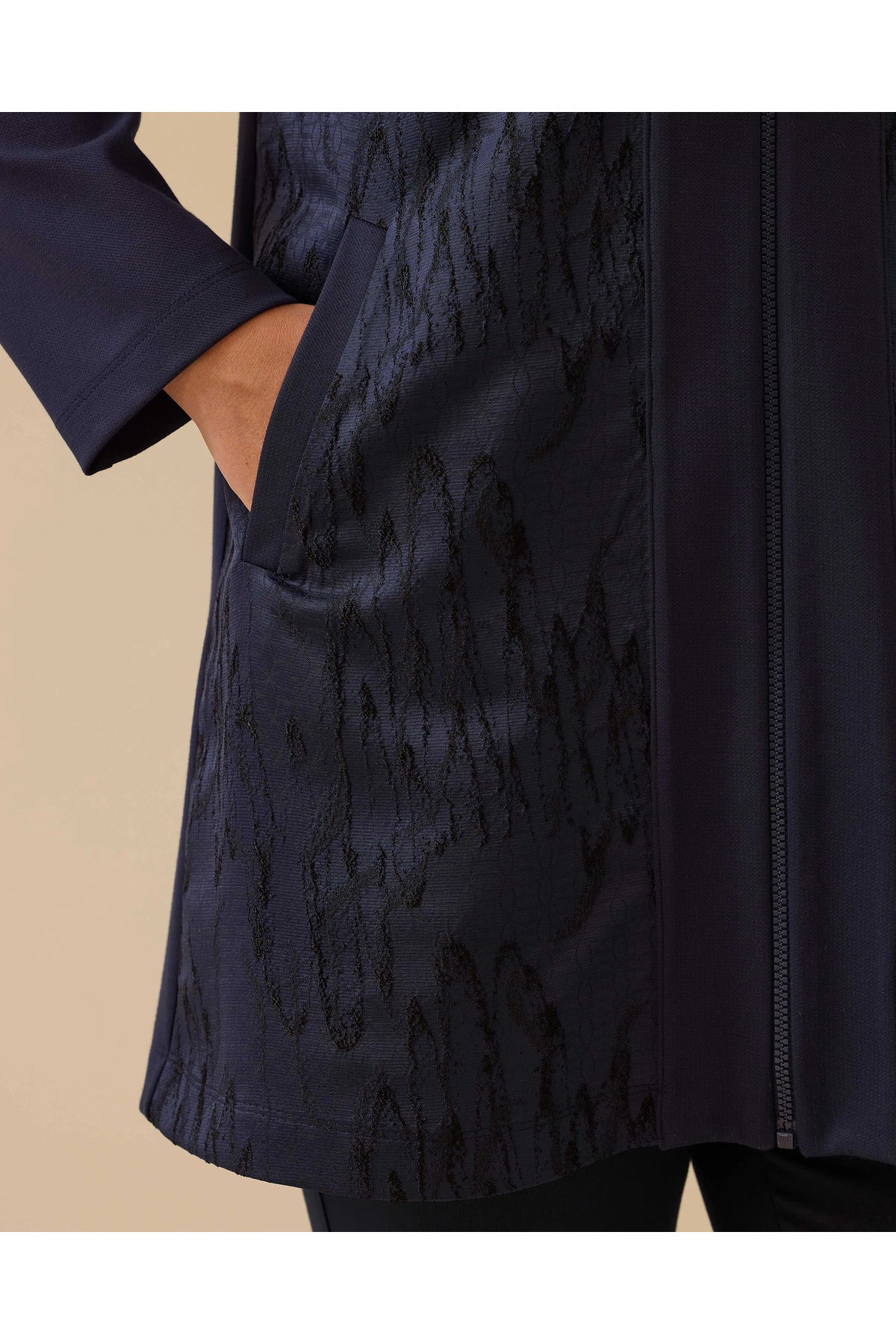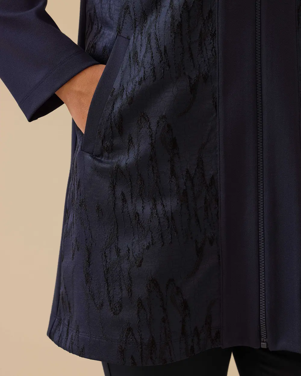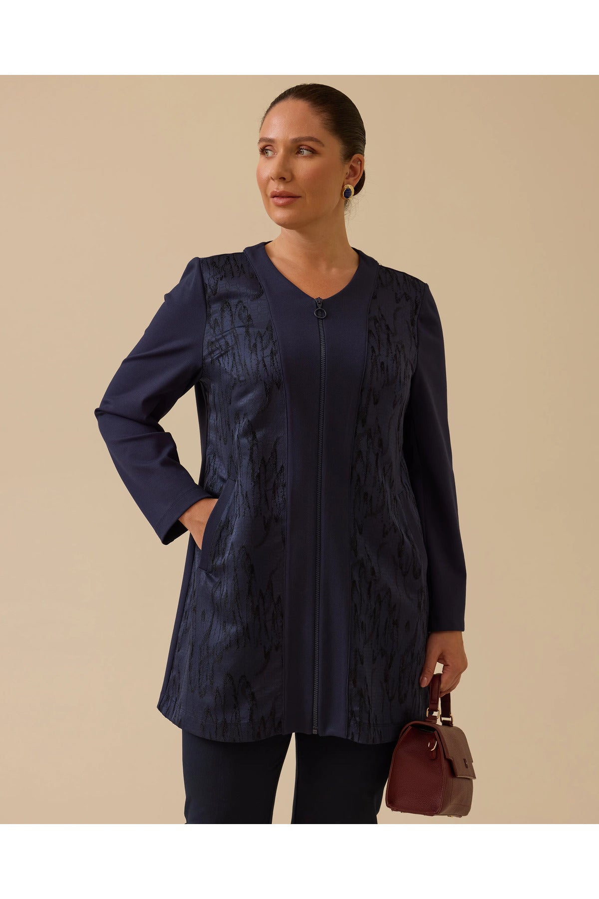 ستكمل هذه السترة ذات المقاسات الكبيرة والمزينة بنقوش وسحاب أمامي والمصنوعة من قماش الجاكار إطلالتك الأنيقة بتصميمها العصري وملاءمتها المريحة.