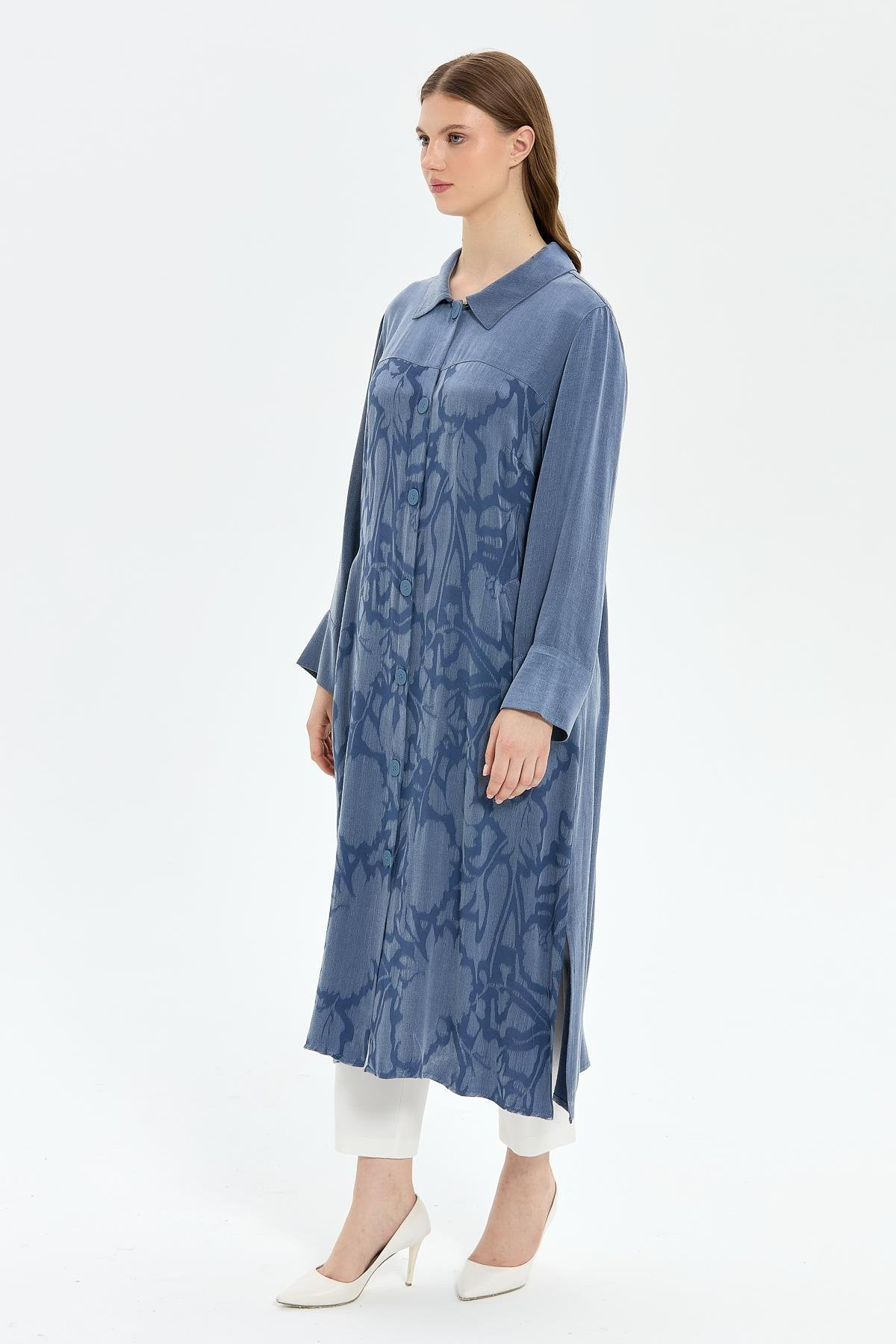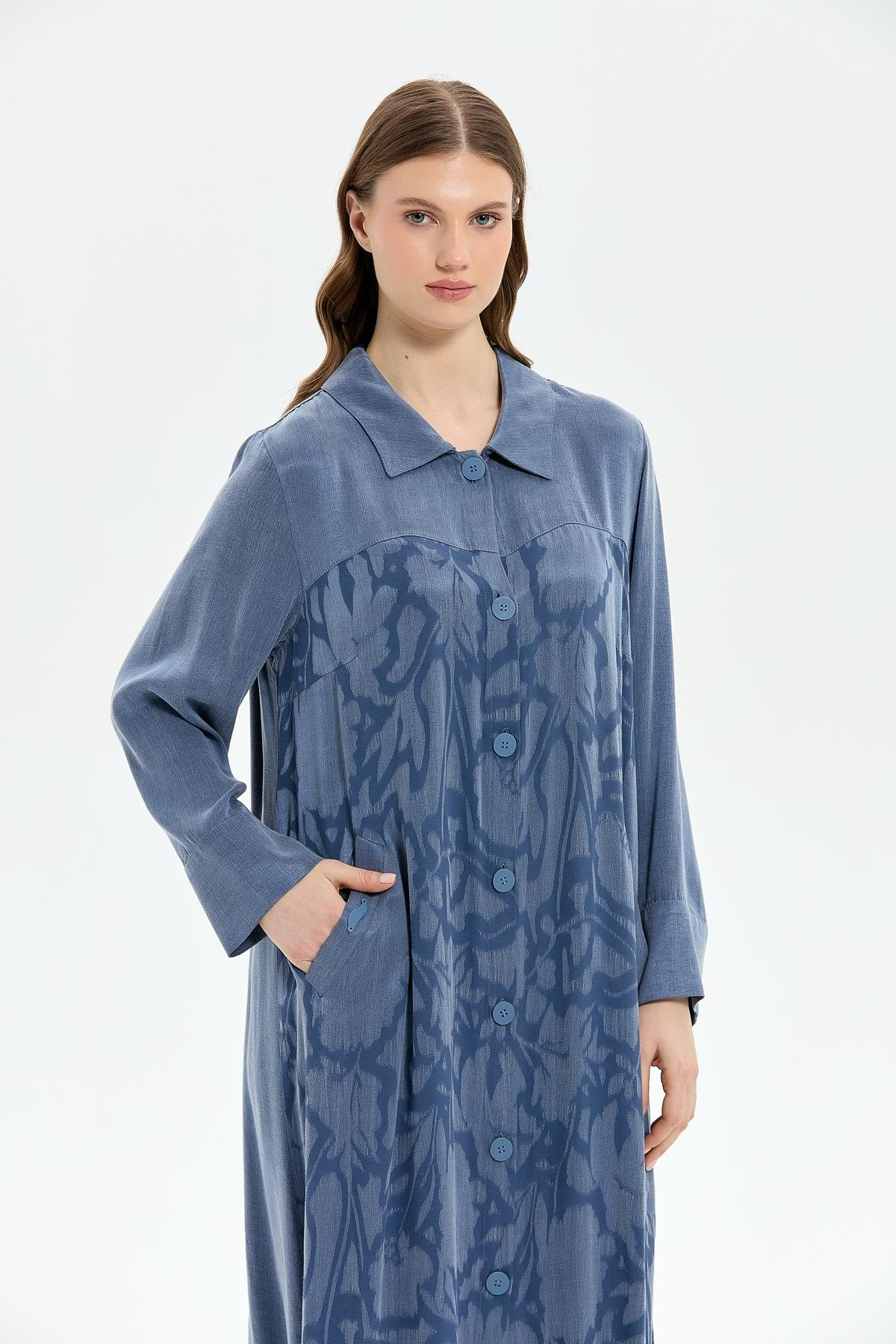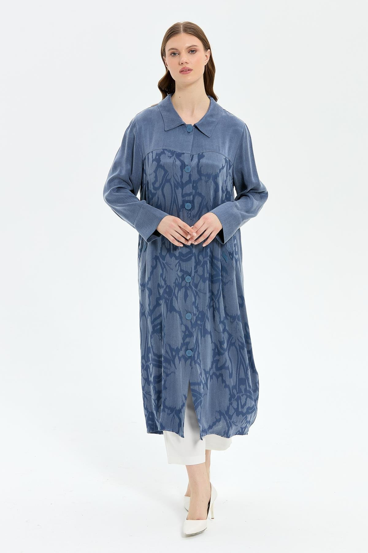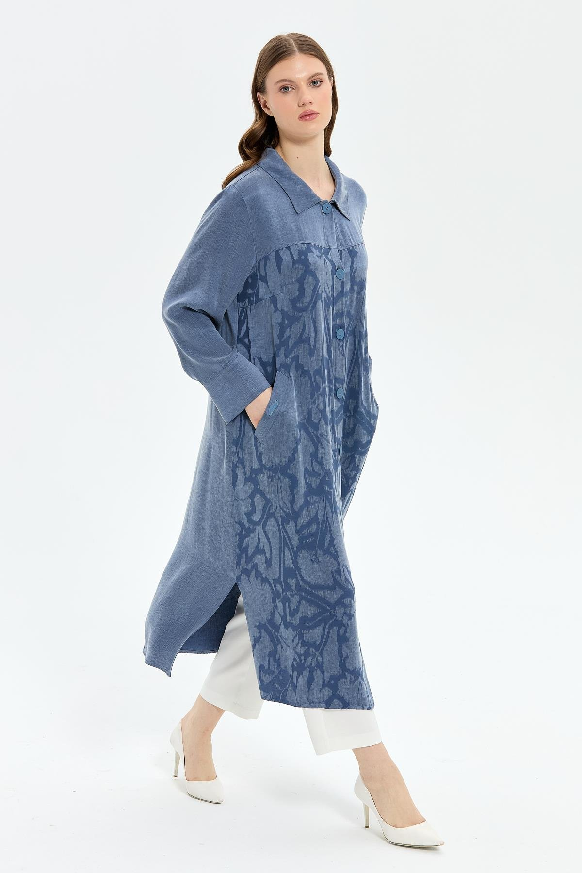 معطف من قماش الكوبرو الحريري المنسوج. إغلاق بأزرار. مزين بنقوش وحواف سادة. مقاسه مطابق للمقاسات المعتادة. طول المعطف 123 سم.