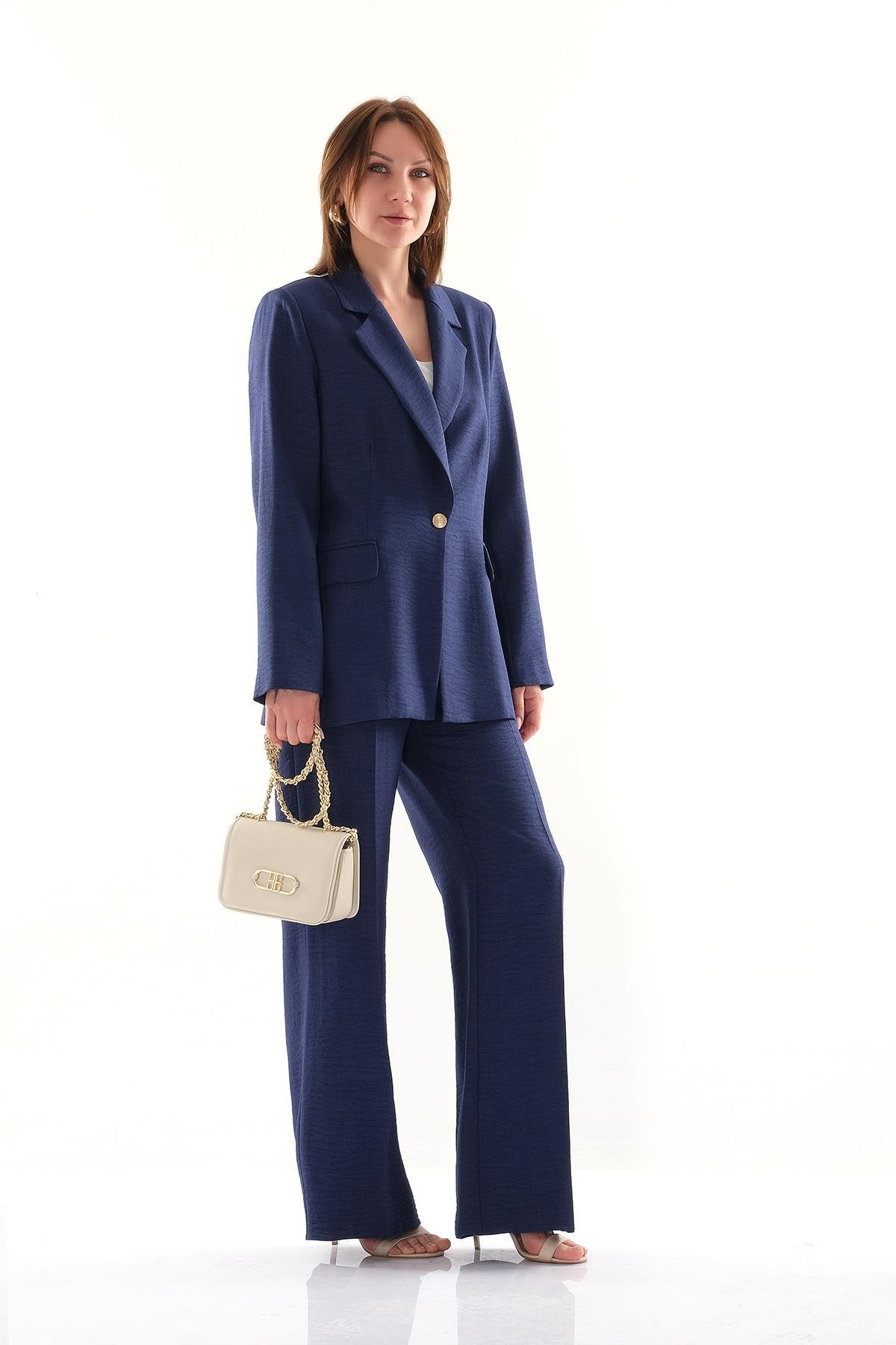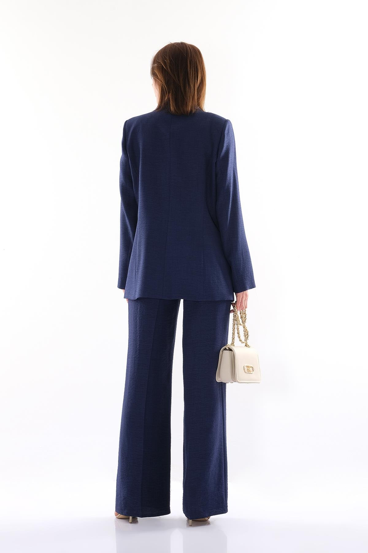 سترة بزر واحد وبنطال واسع الساقين بسحاب مخفي .