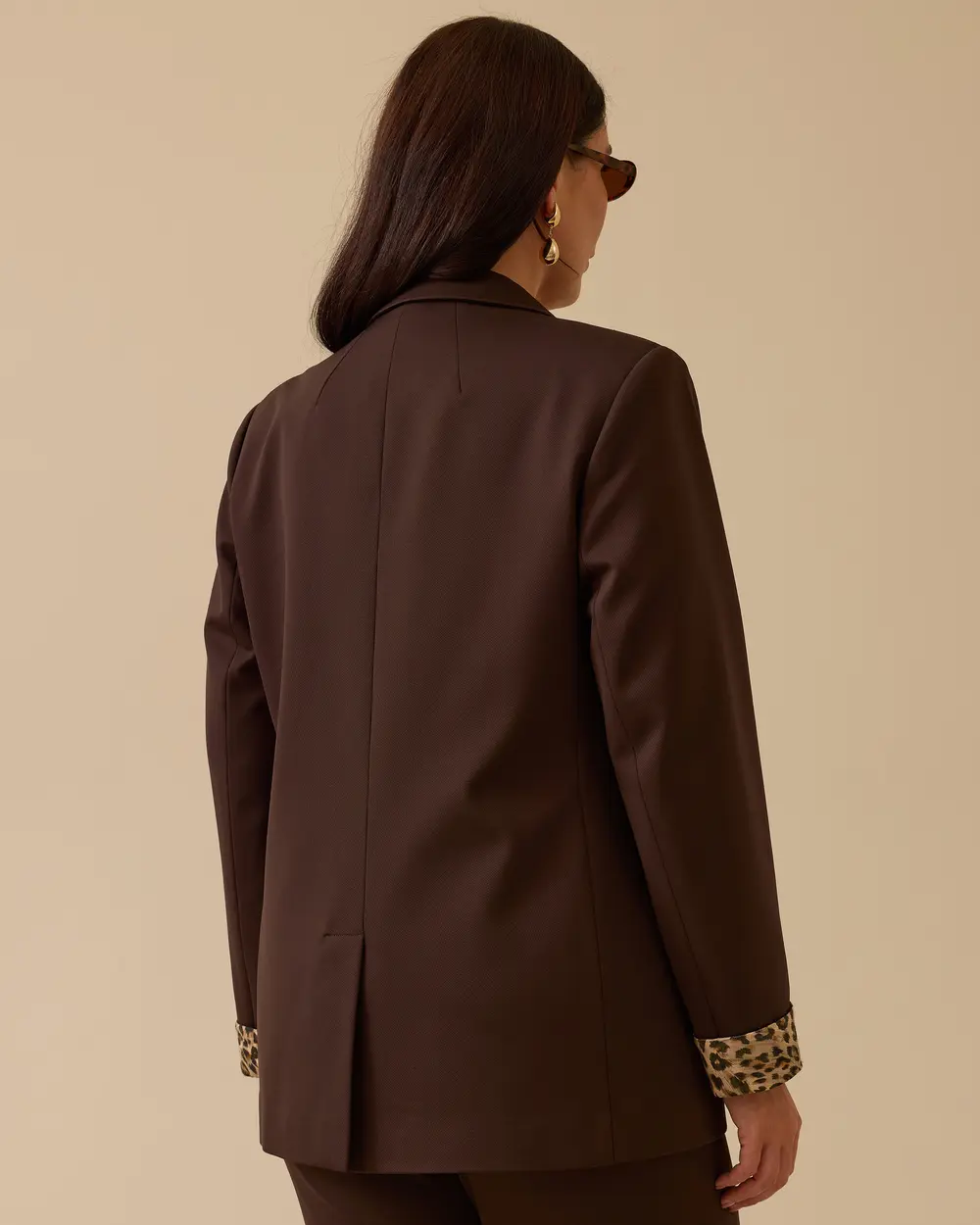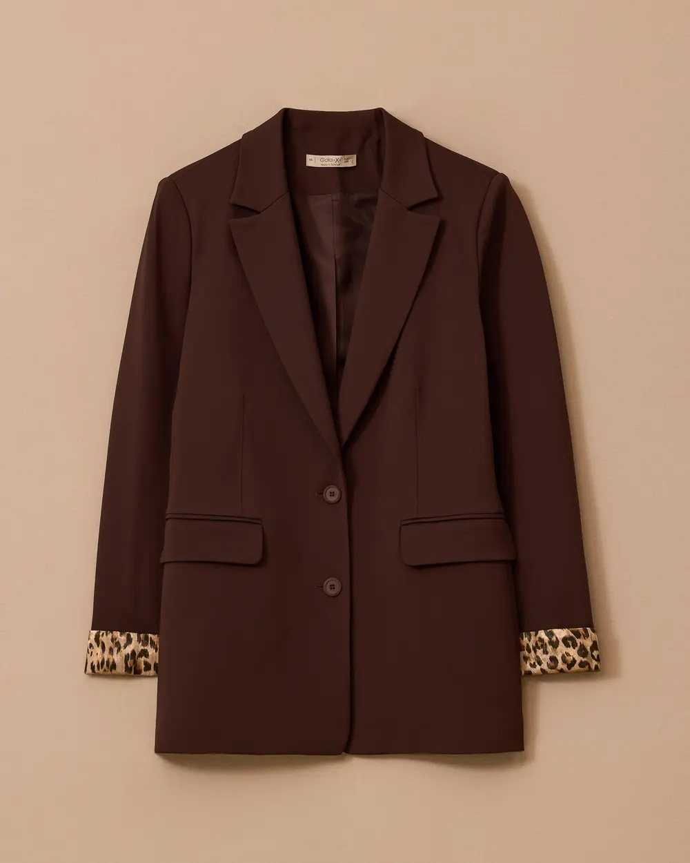 تتميز هذه السترة ذات المقاسات الكبيرة بنقشة جلد النمر وأزرارها المزدوجة، مما يوفر مظهراً أنيقاً وجذاباً.