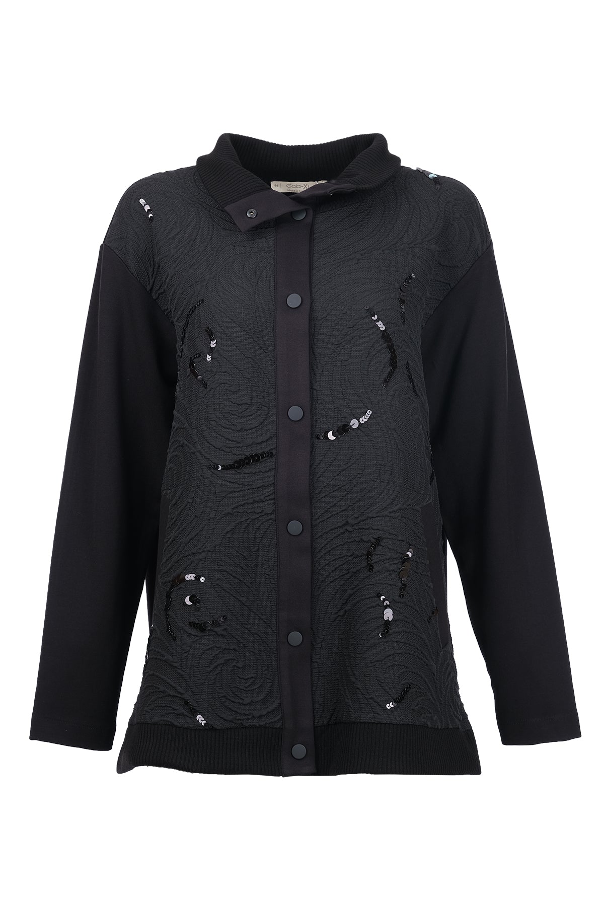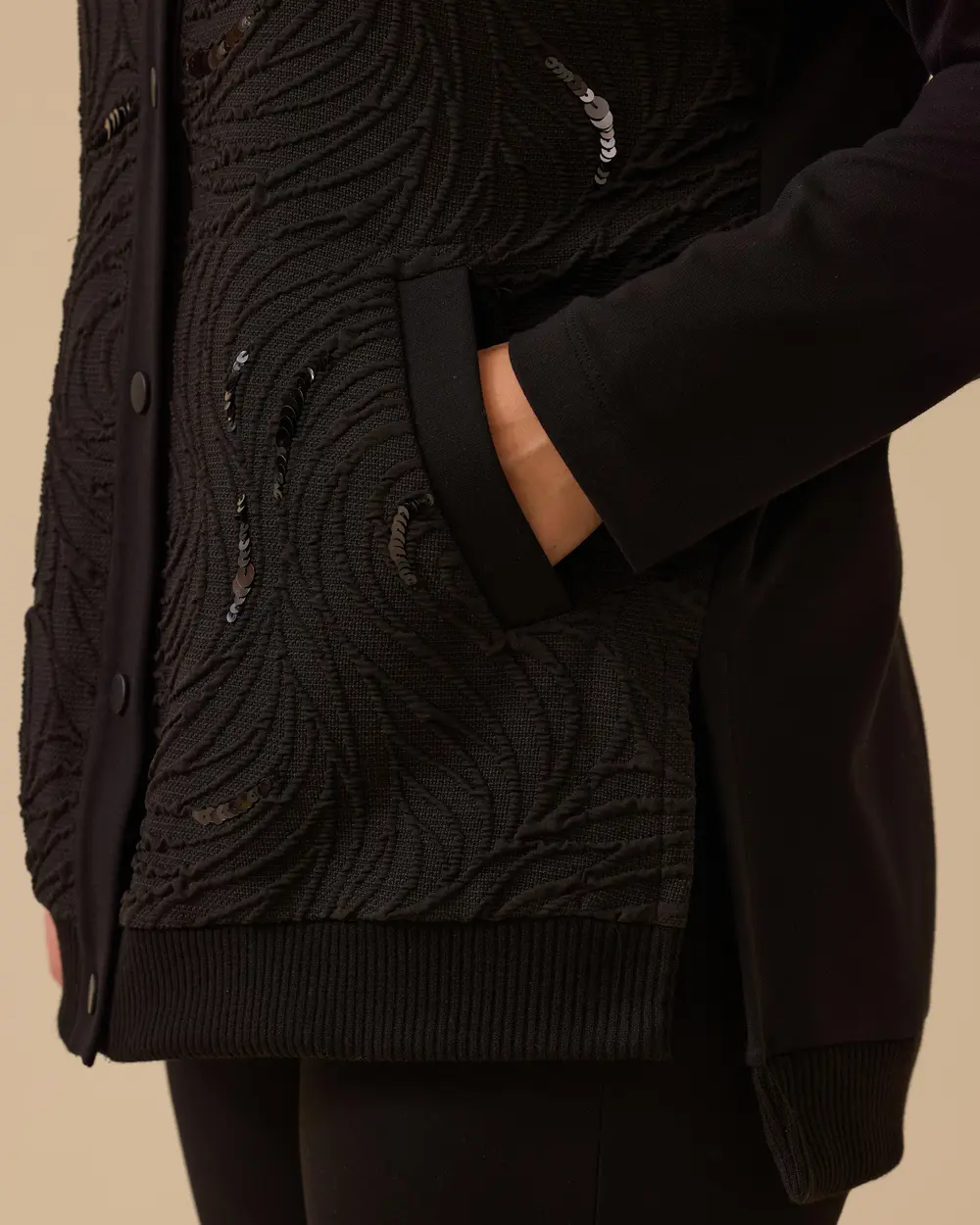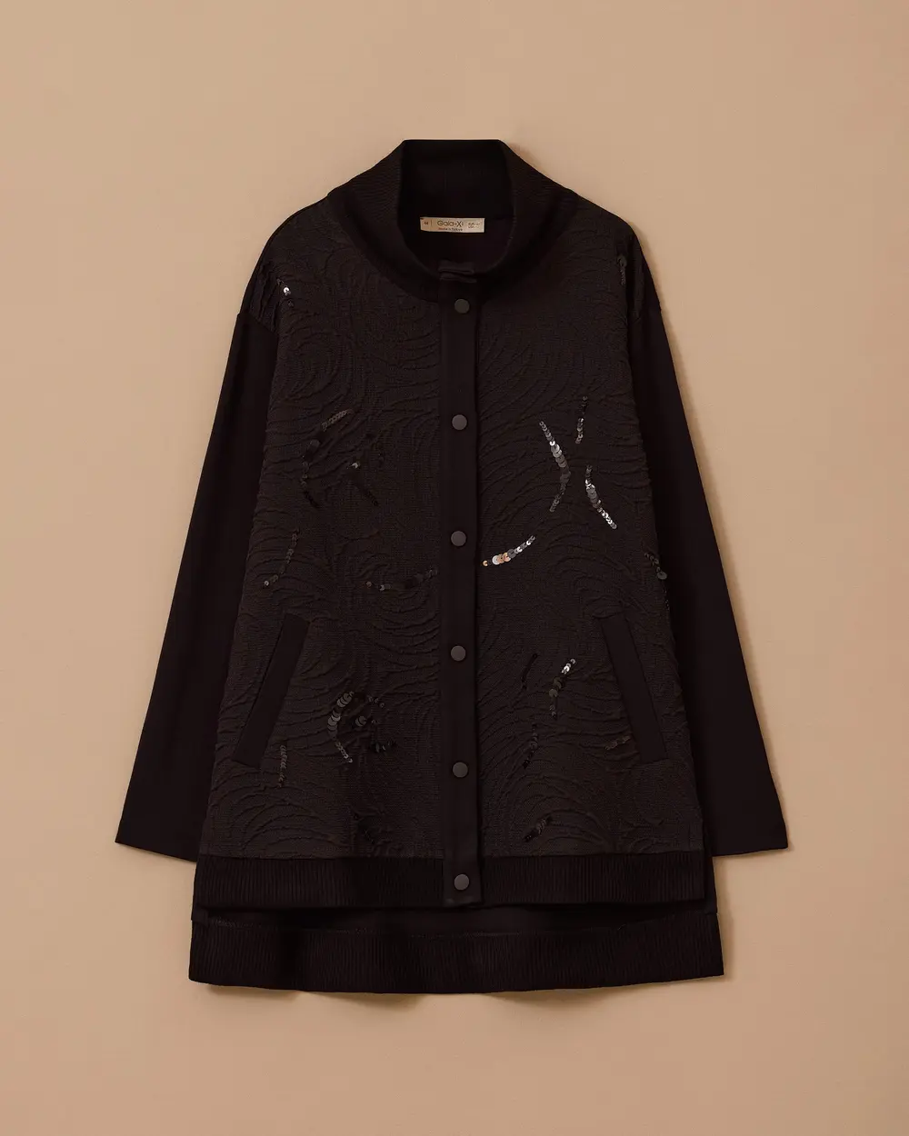 هذه السترة المطرزة والمزينة بالترتر ذات المقاسات الكبيرة مناسبة للارتداء اليومي بفضل تصميمها المريح وسطحها المنقوش .