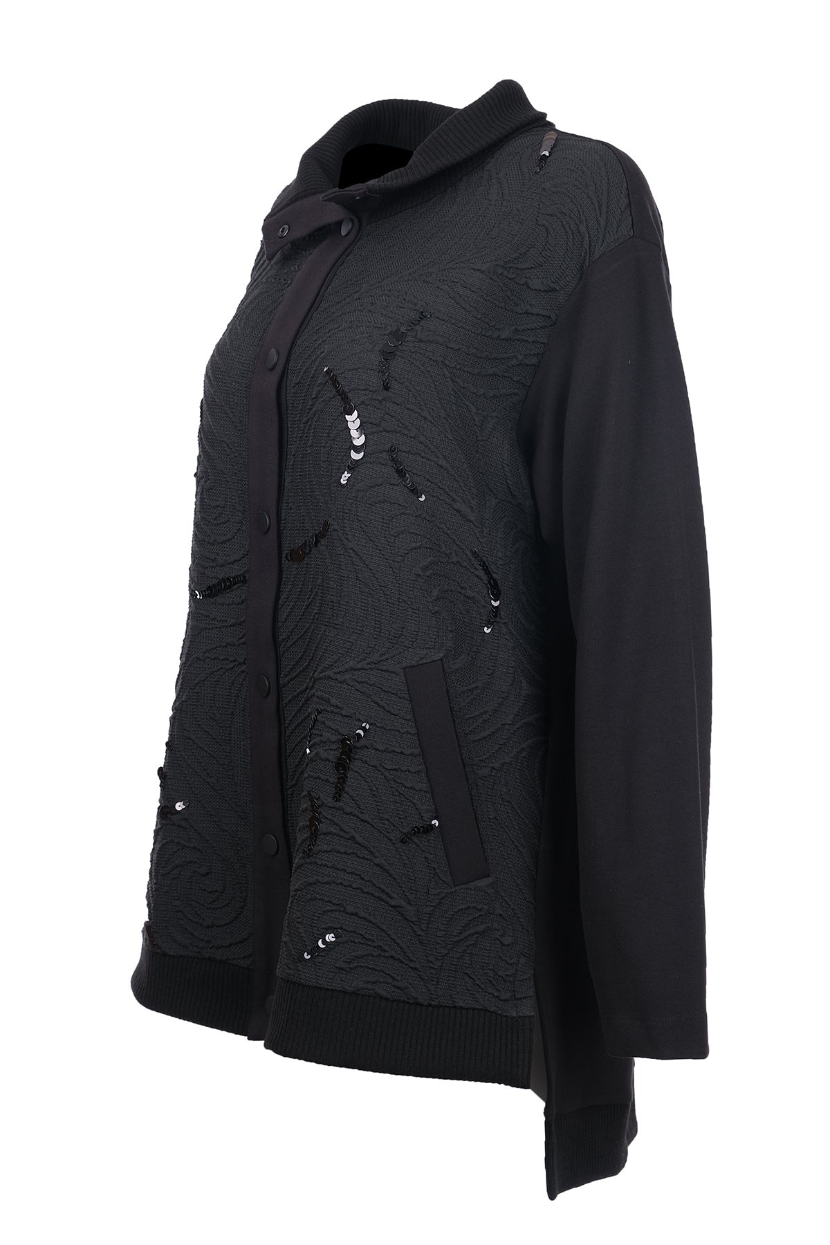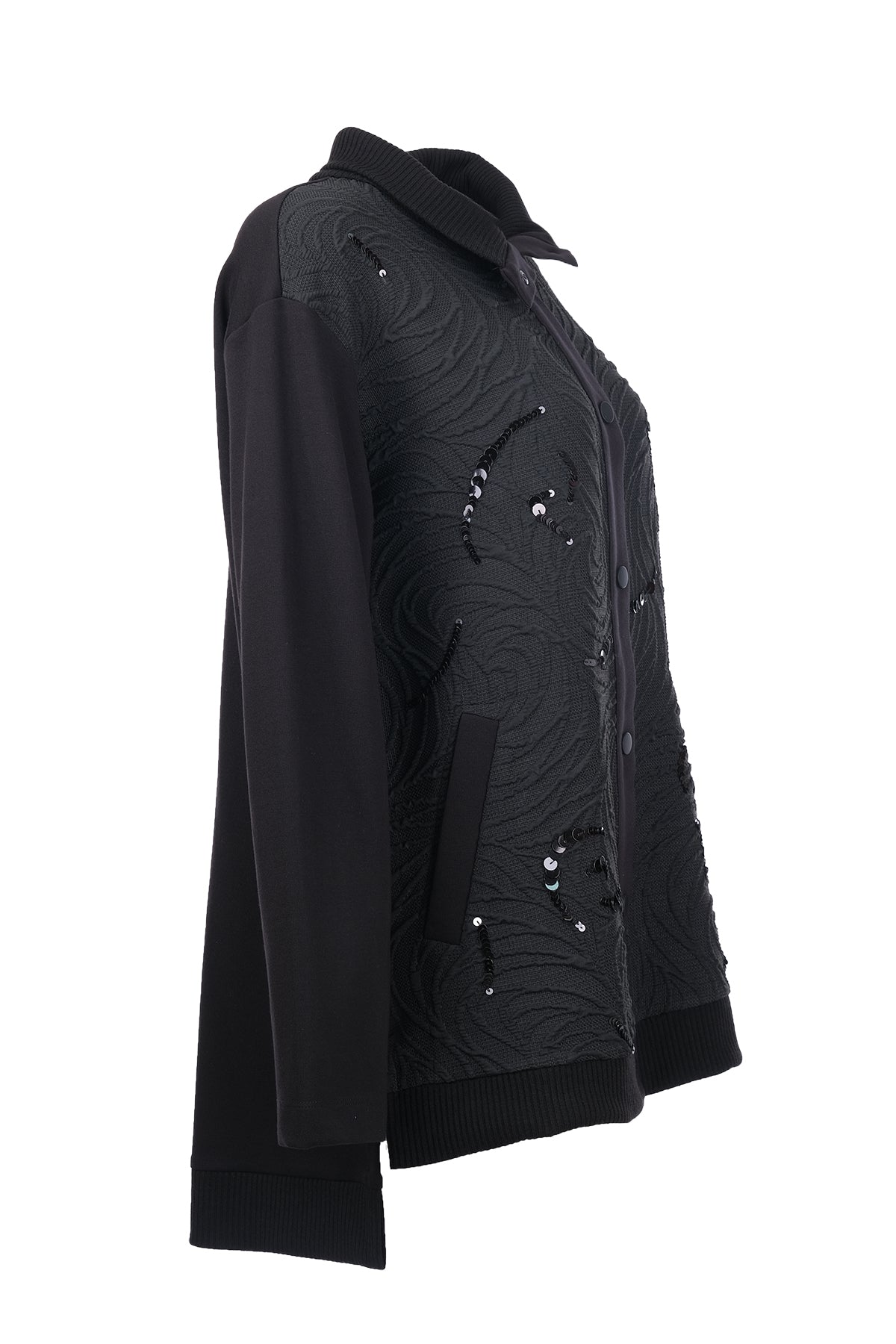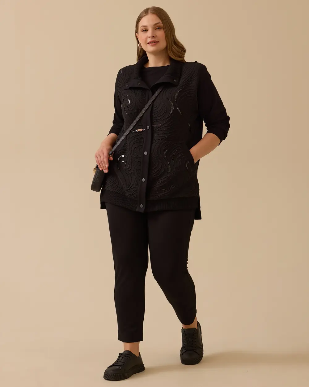 هذه السترة المطرزة والمزينة بالترتر ذات المقاسات الكبيرة مناسبة للارتداء اليومي بفضل تصميمها المريح وسطحها المنقوش .