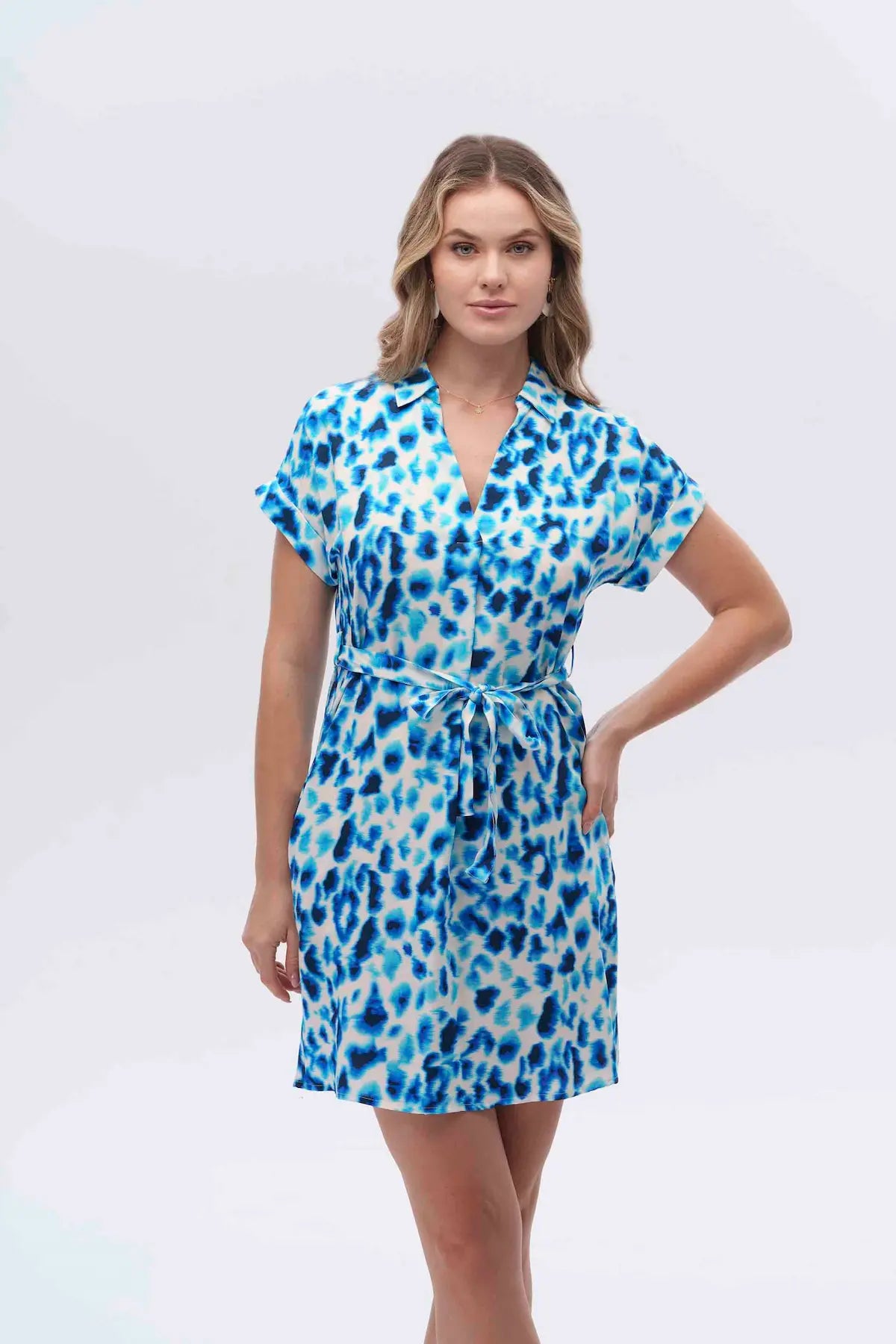 فستان قصير بنقشة جلد النمر من كانيل - قميص بأكمام قصيرة وياقة كاجوال