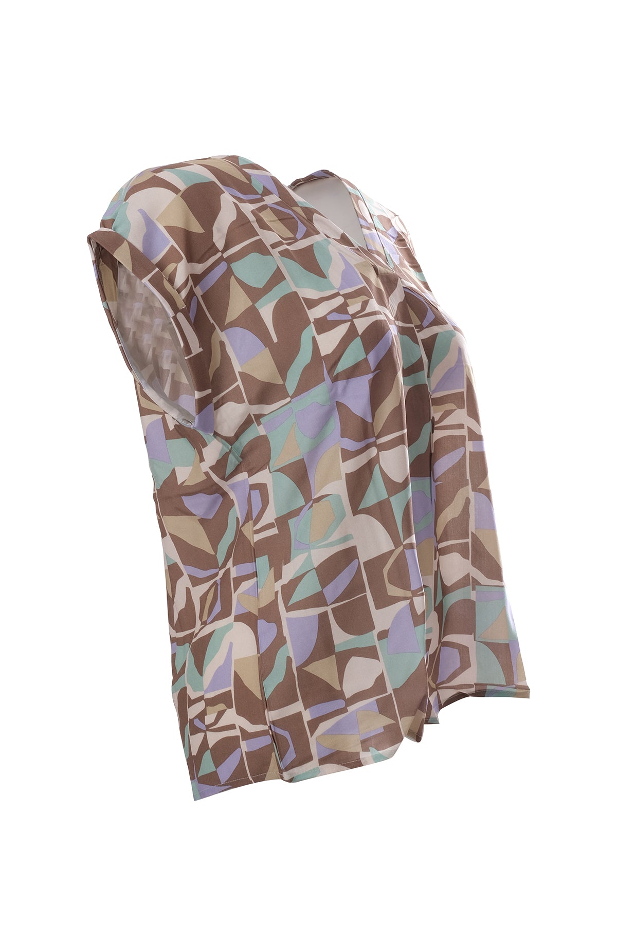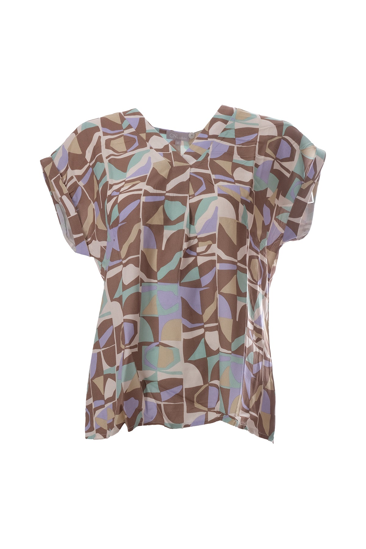 بلوزة نسائية واسعة ذات ياقة على شكل حرف V وأكمام قصيرة من كانيل - بنقشة هندسية