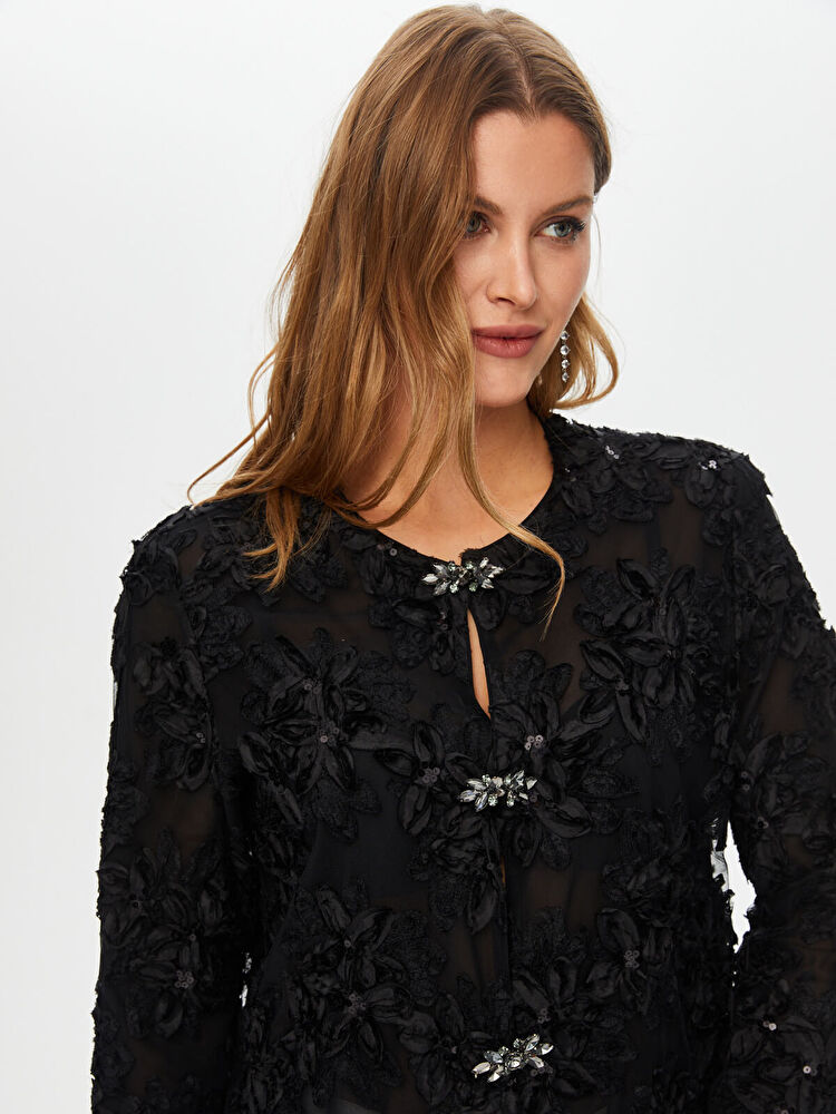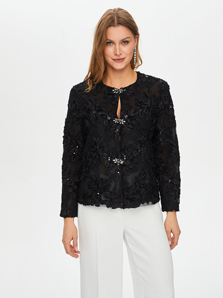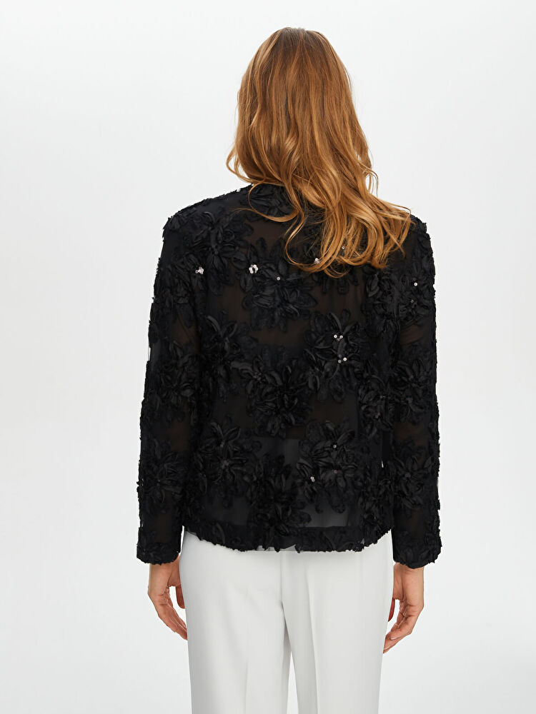 جاكيت سهرة من تصميم فائق سونميز، مزين بتطريزات زهرية وتفاصيل من الترتر.