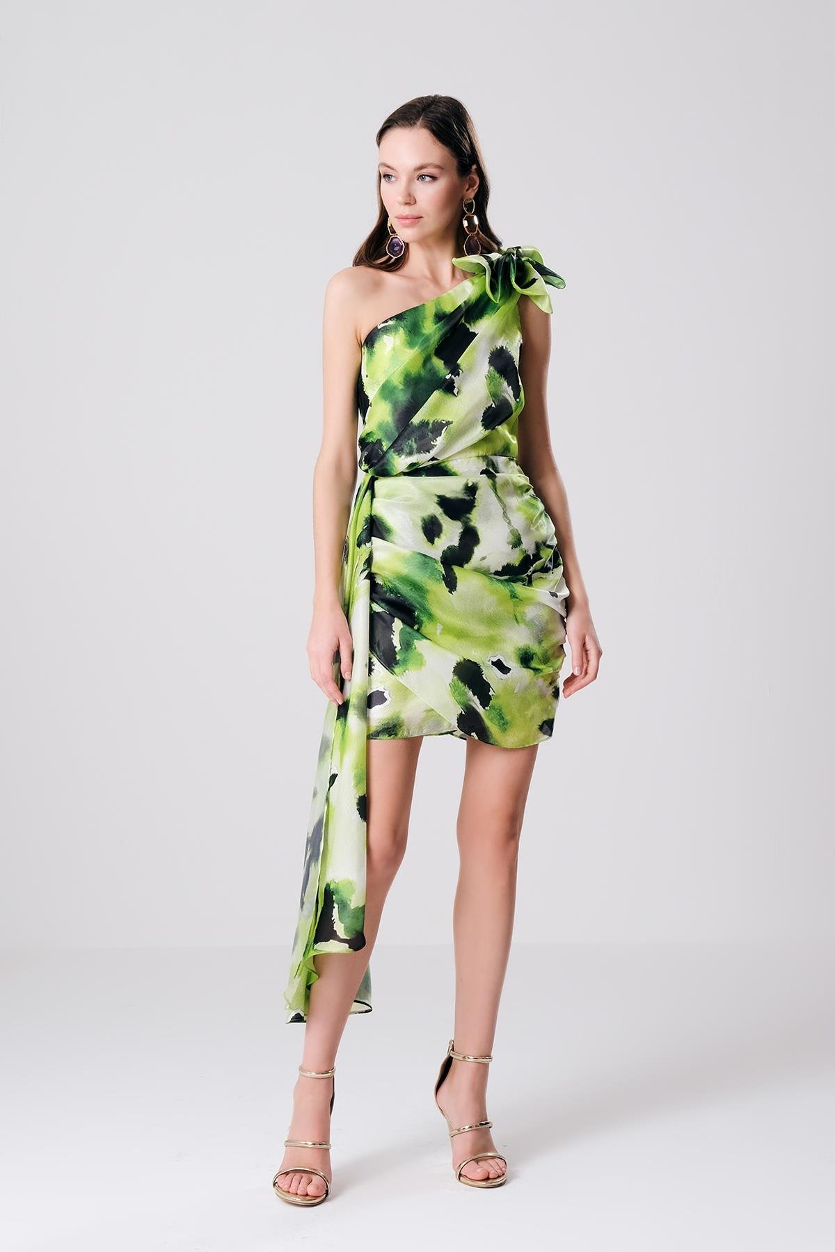 فستان سهرة قصير أنيق مكشكش بكتف واحد من الساتان المنقوش