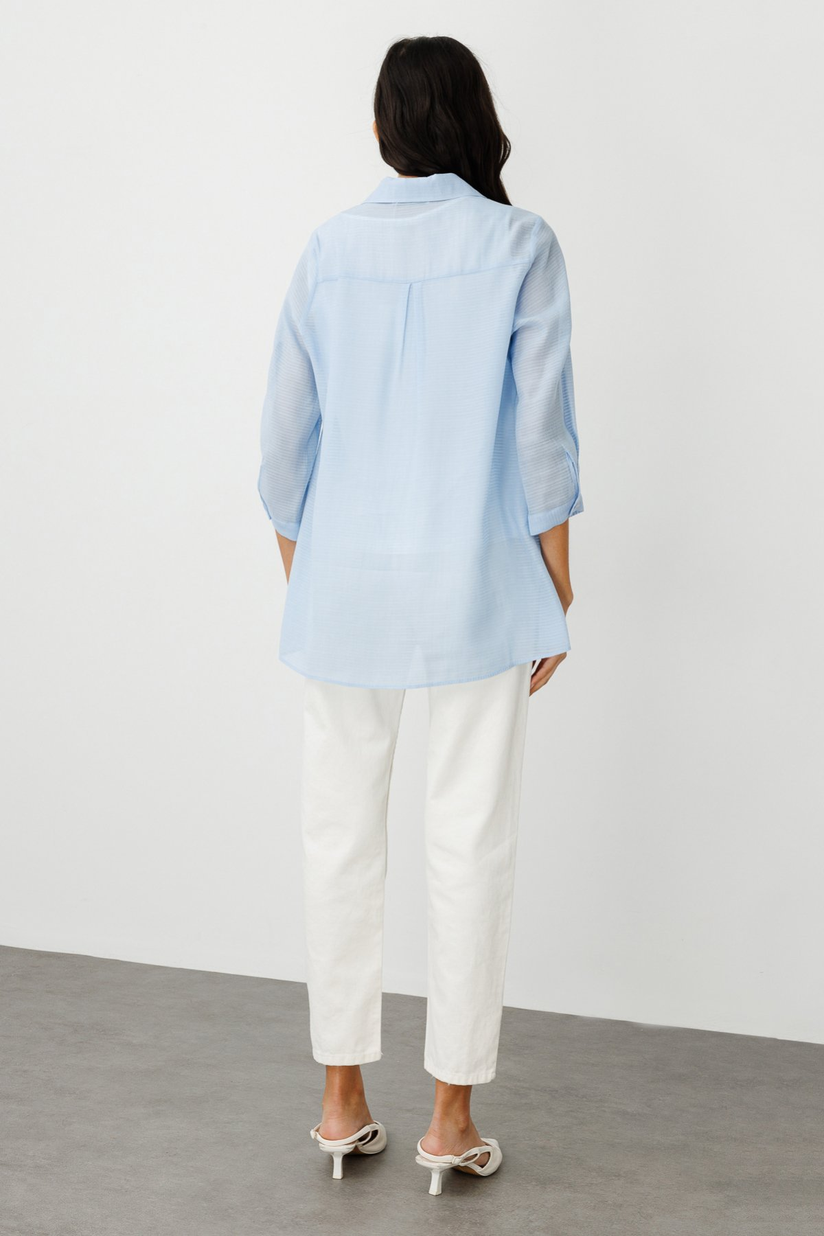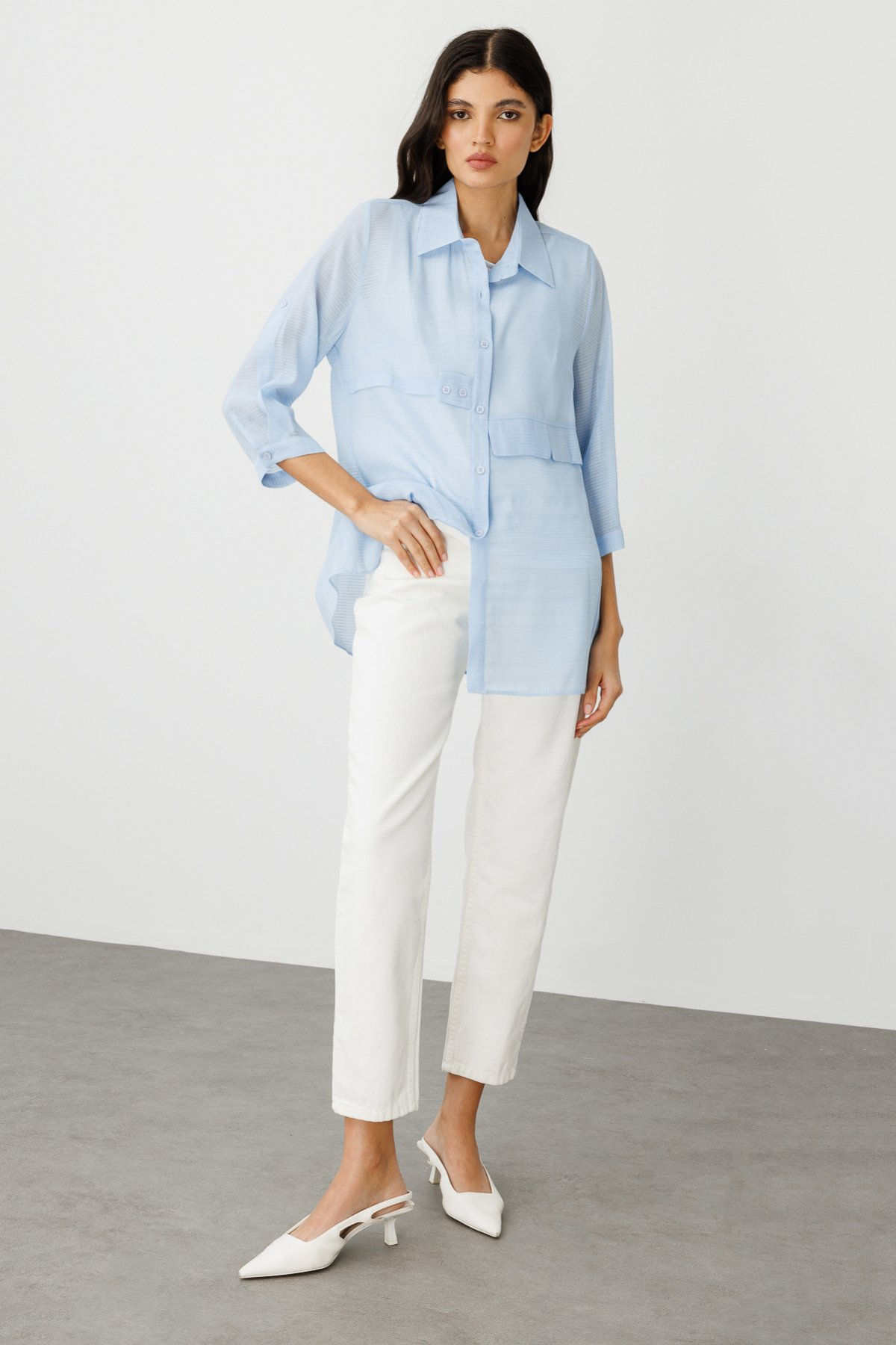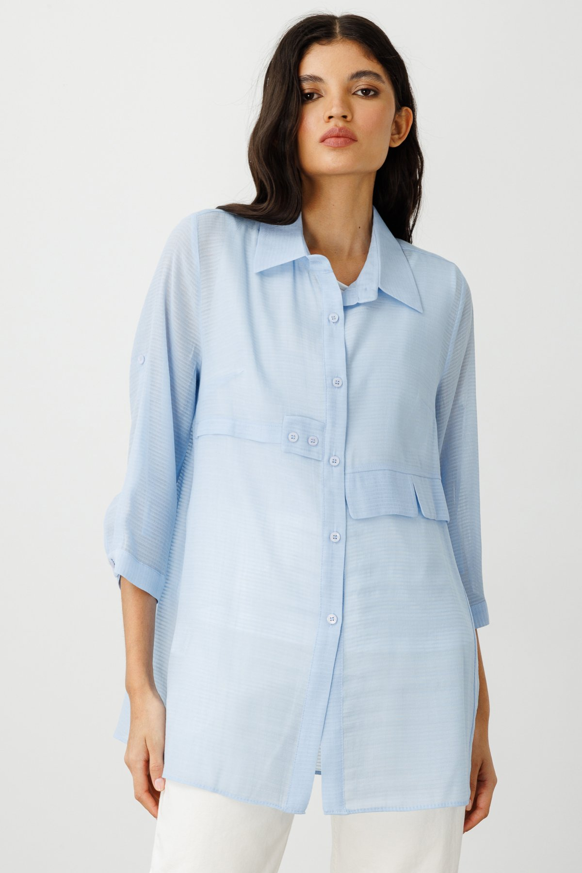 ميزات المنتج: ياقة قميص، إغلاق بأزرار، كم داخلي، أكمام ثلاثة أرباع، تصميم بنقش ذاتي.