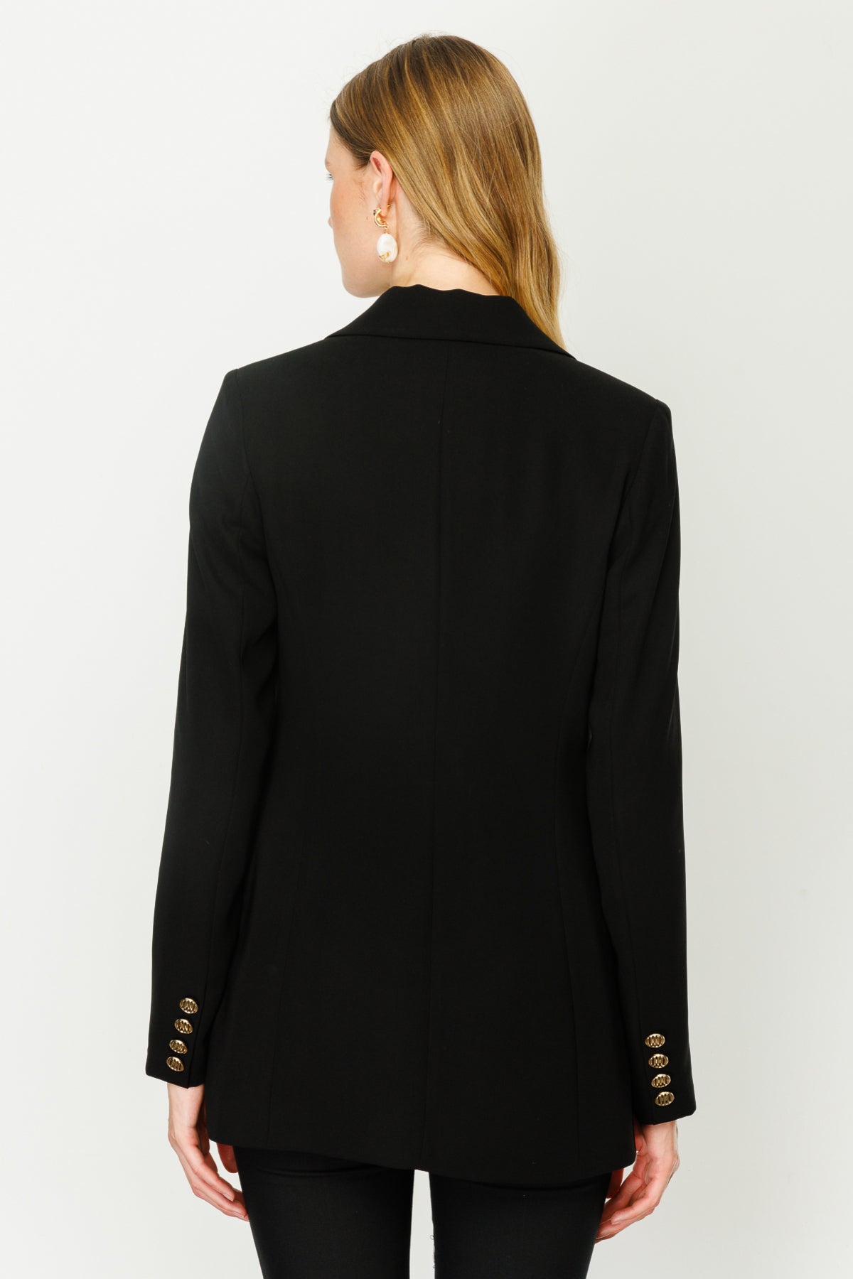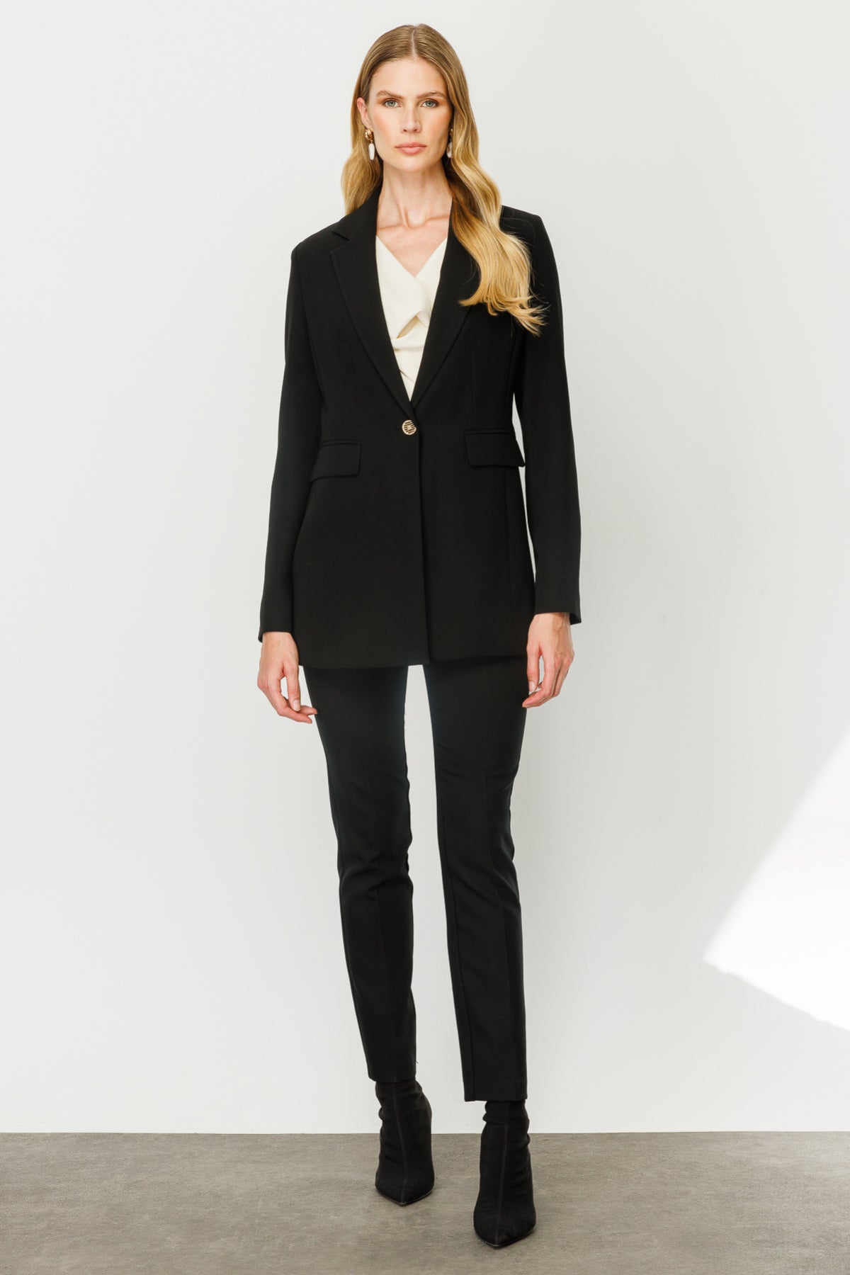 ميزات المنتج: - طويل؛ - إغلاق بزر واحد؛ - مبطن؛ - جيب صدر مزخرف؛ - جيب بغطاء؛ - مقاس المنتج: مقاس عادي؛ - طول المنتج: 74 سم؛ - تركيبة القماش: 100% بوليستر؛ قياسات العارضة؛ مقاس العينة: إيكول: 38؛ طول العارضة: 176 سم؛ قياسات العارضة: 84/61/89؛