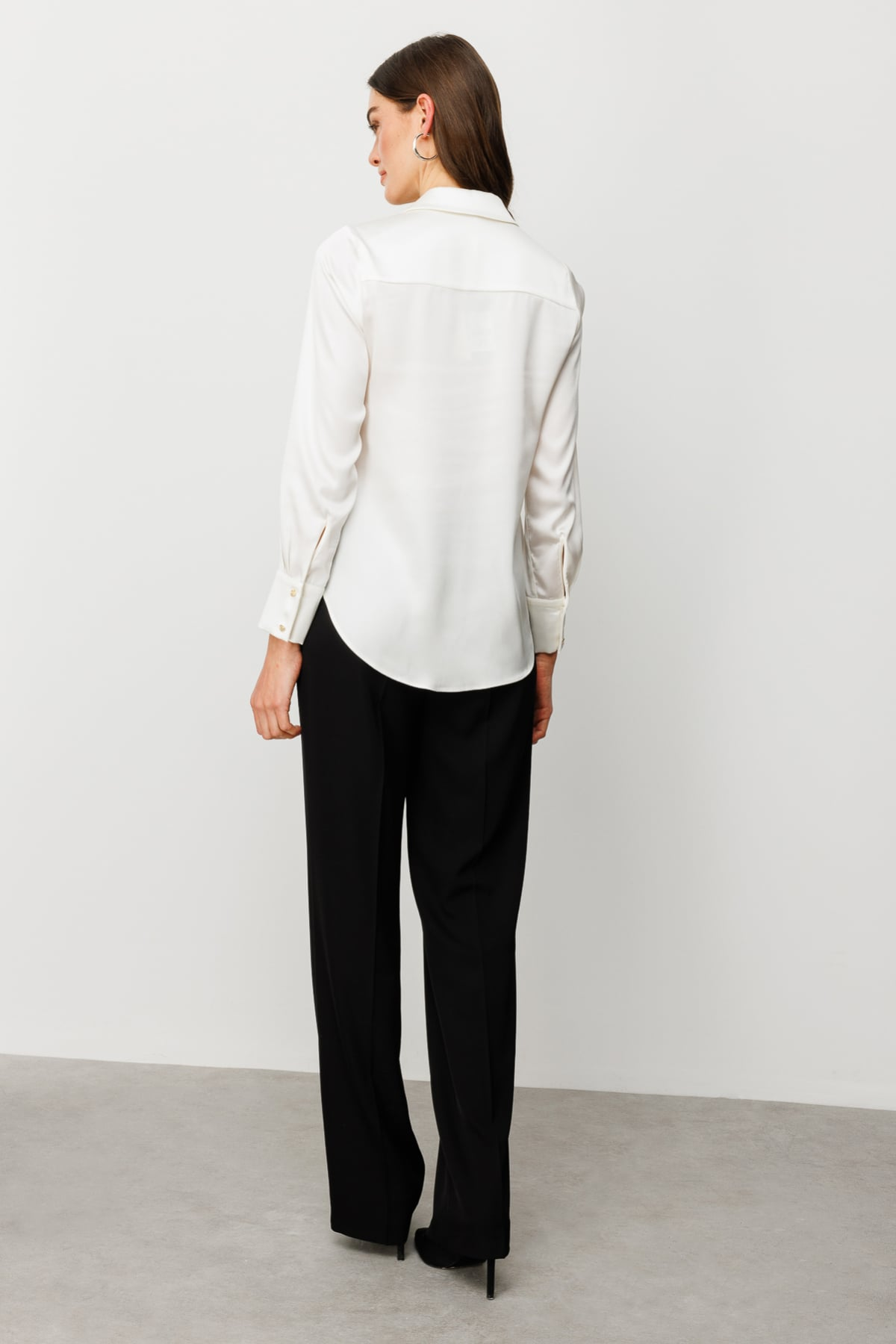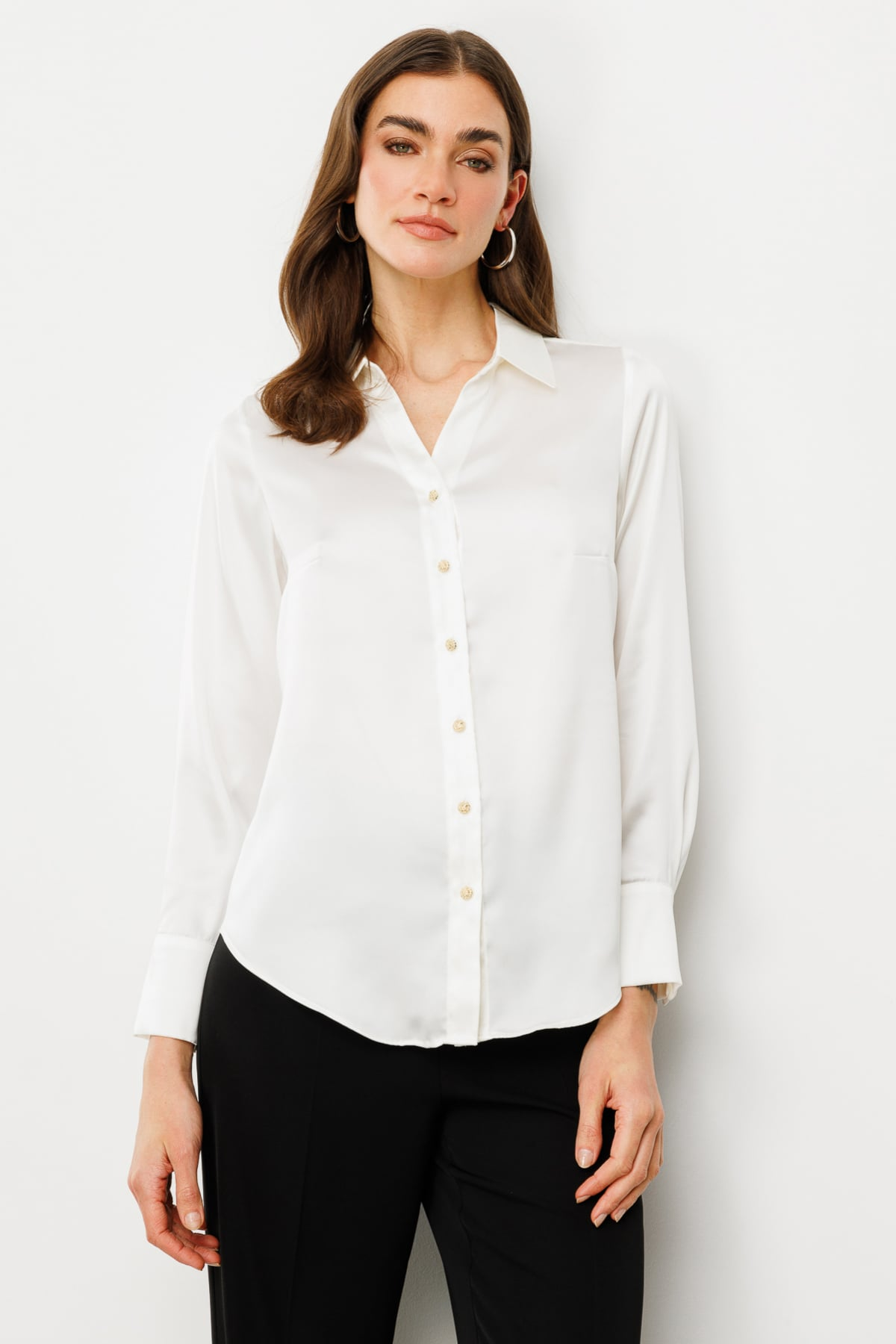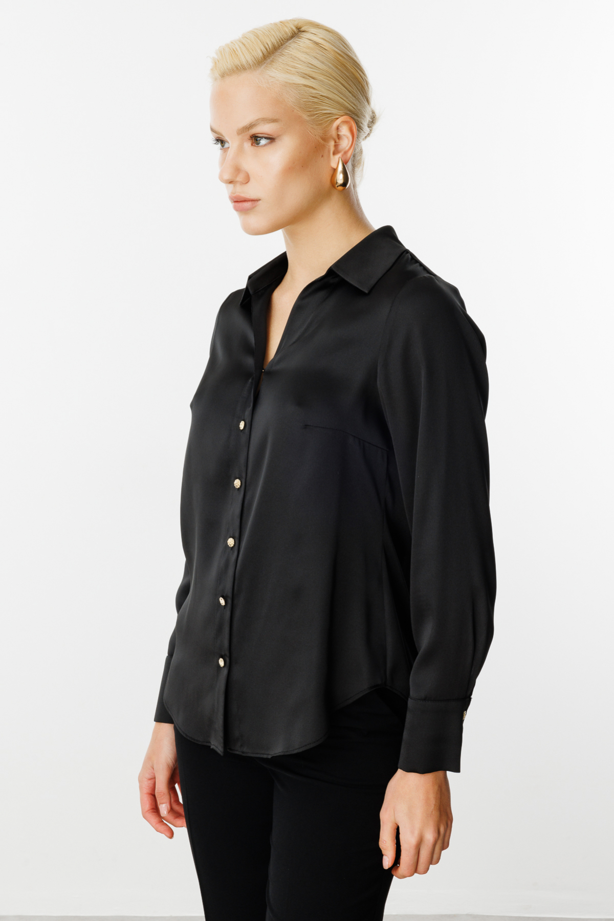 ميزات المنتج: ساتان، إغلاق بأزرار، أكمام بأزرار، ثنيات عند الصدر.