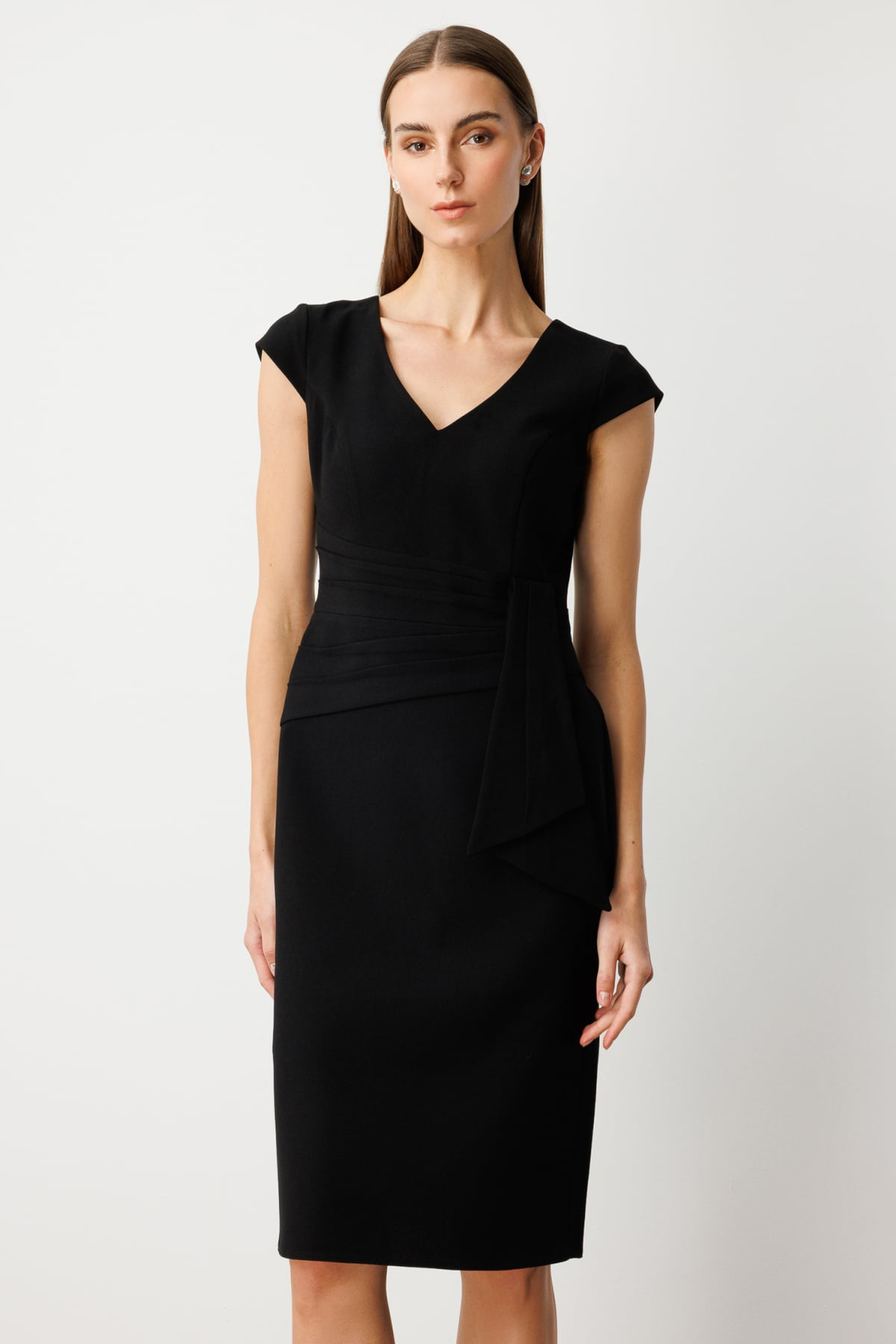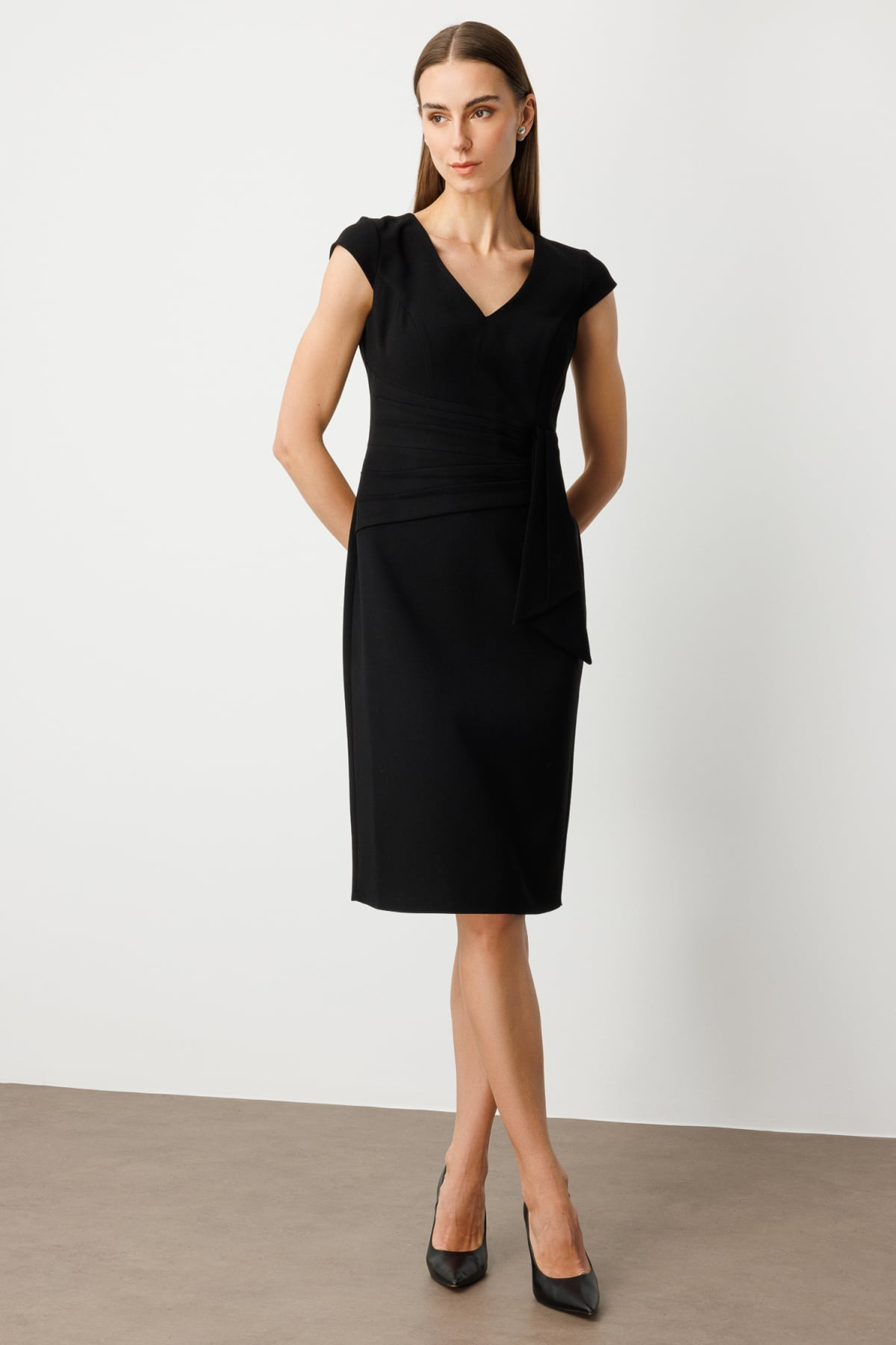 فستان إيكول بياقة على شكل حرف V مع حزام مزخرف