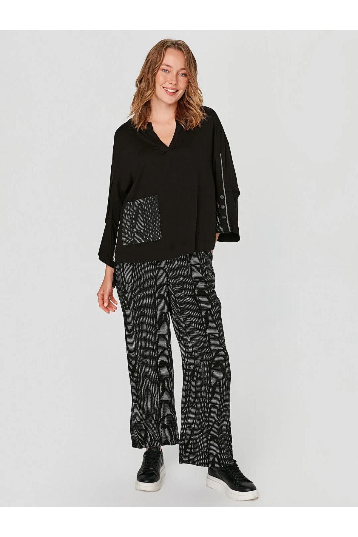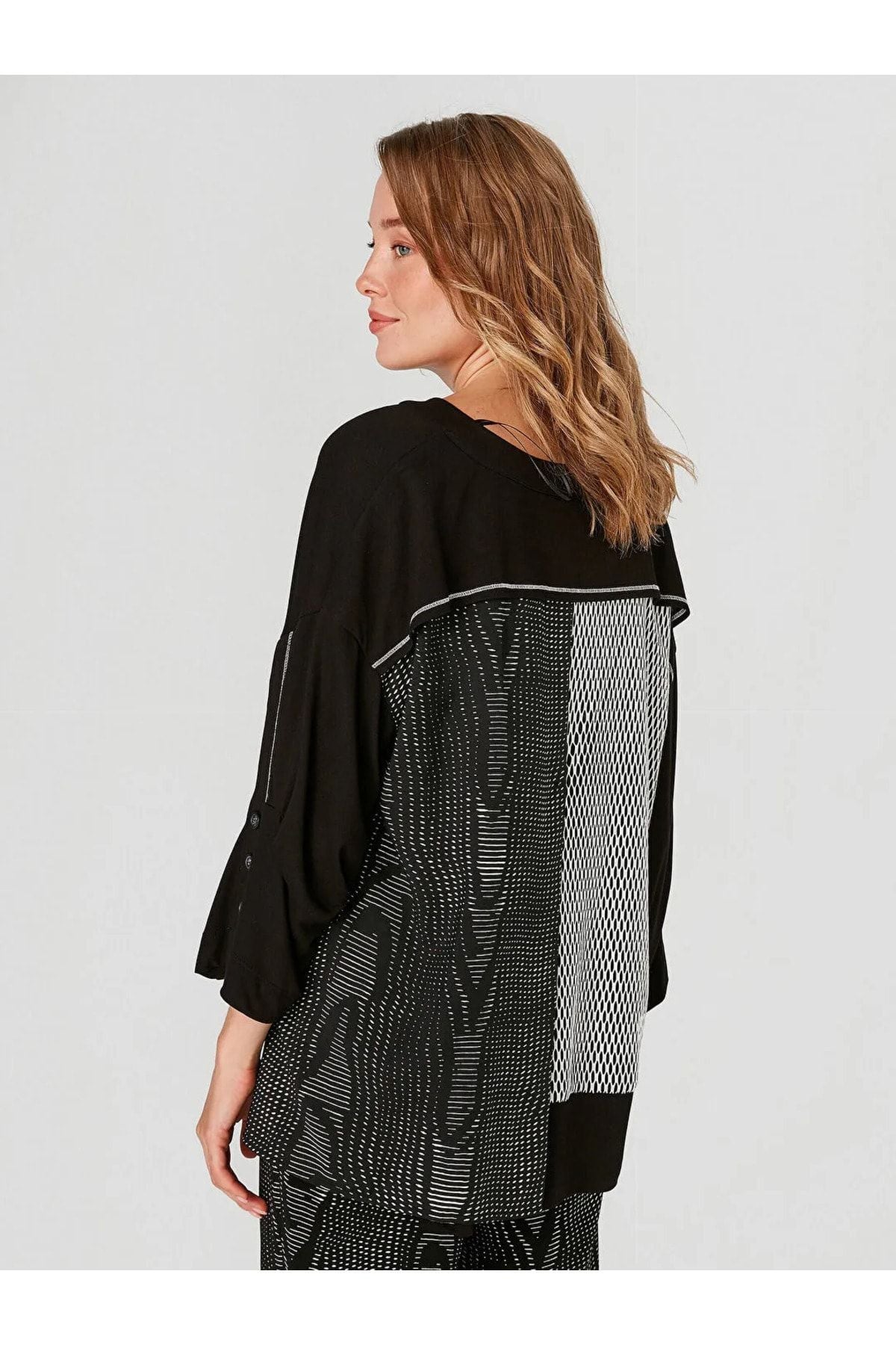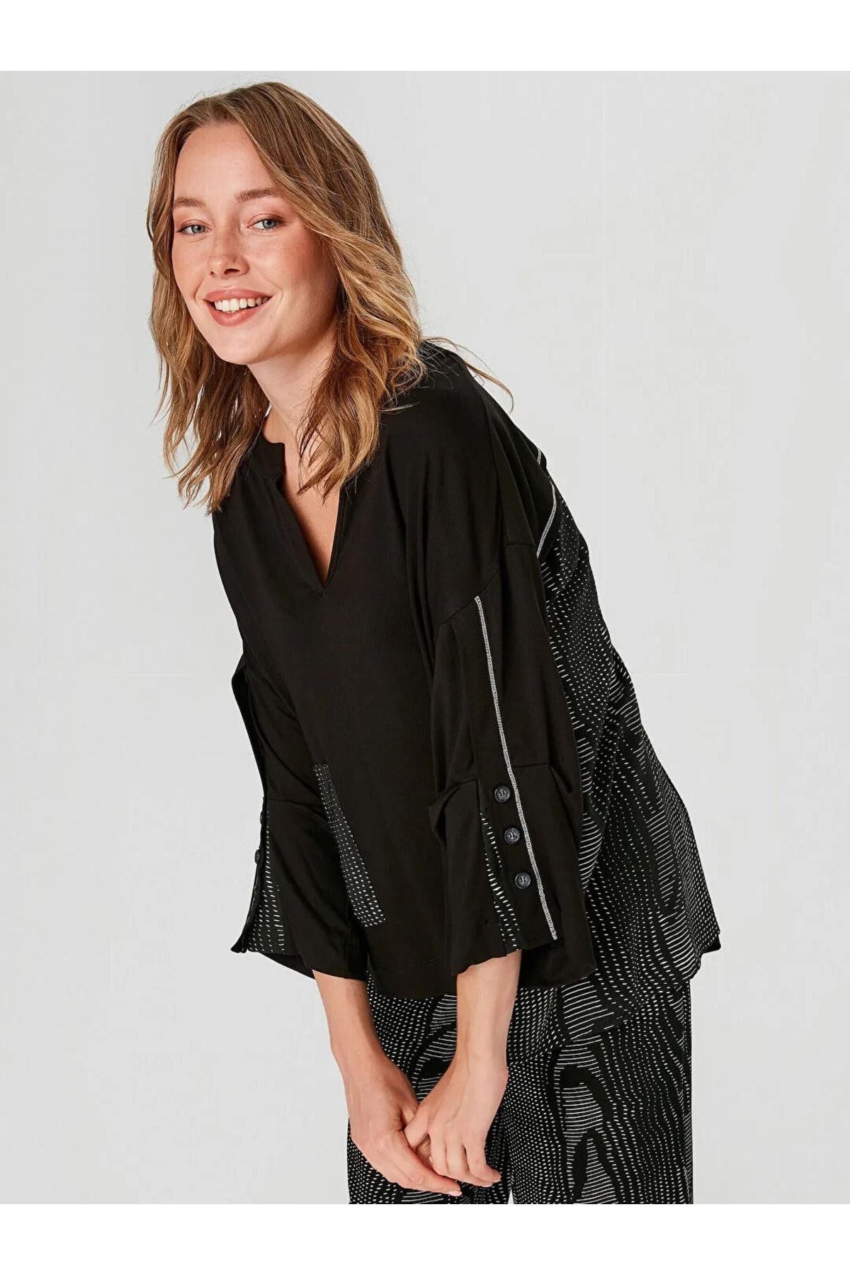 قياسات العارضة: الوزن: 52 كجم / الطول: 1.73 سم / الصدر: 86 سم / الخصر: 65 سم / الأرداف: 92 سم / المقاس: صغير تركيبة القماش: 35% قطن، 35% فيسكوز، 20% بوليستر، 5% ليكرا، 5% نايلون