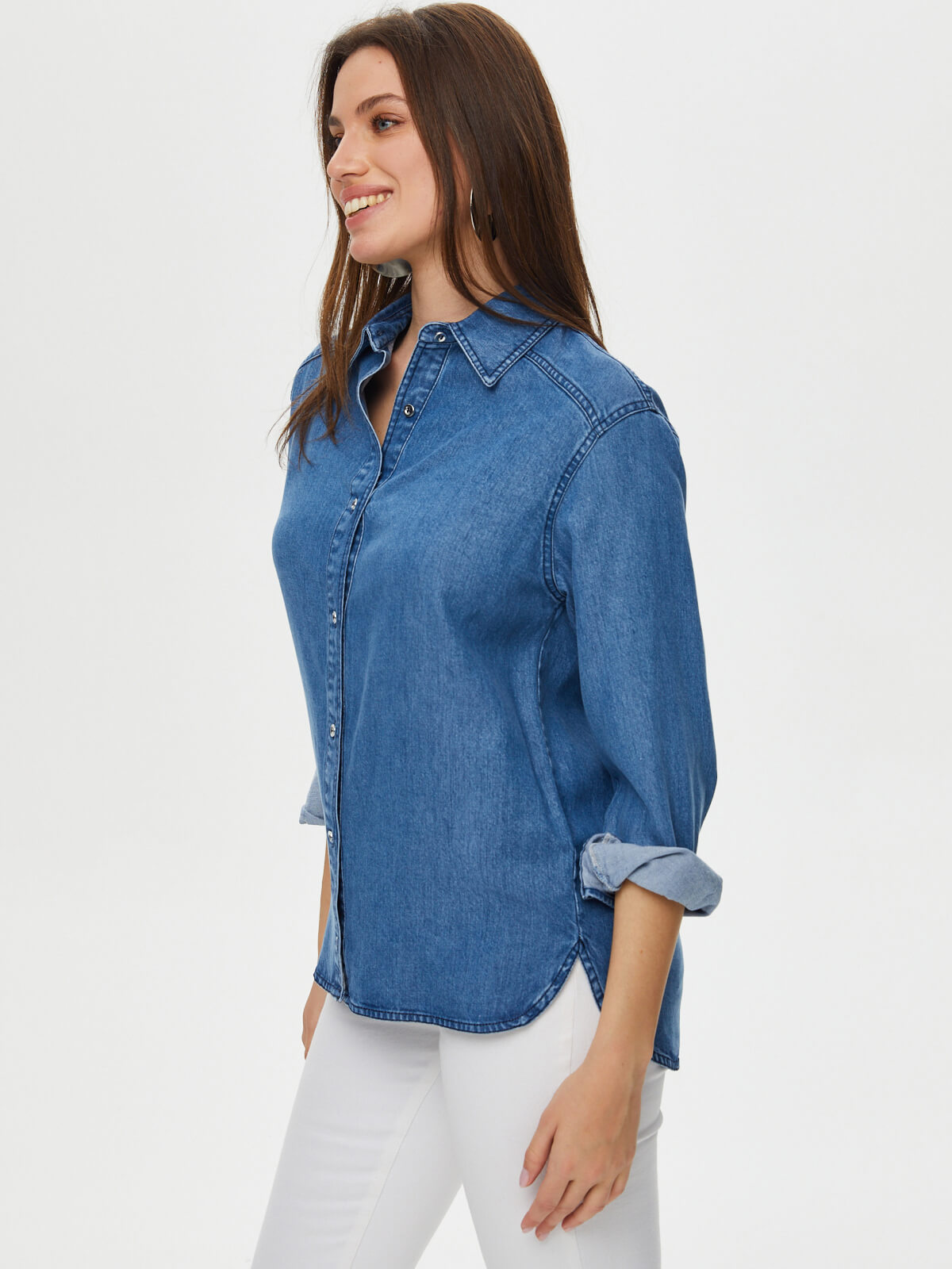 قميص جينز كبير الحجم من Faik Sönmez - طراز بسيط بأكمام طويلة للنساء