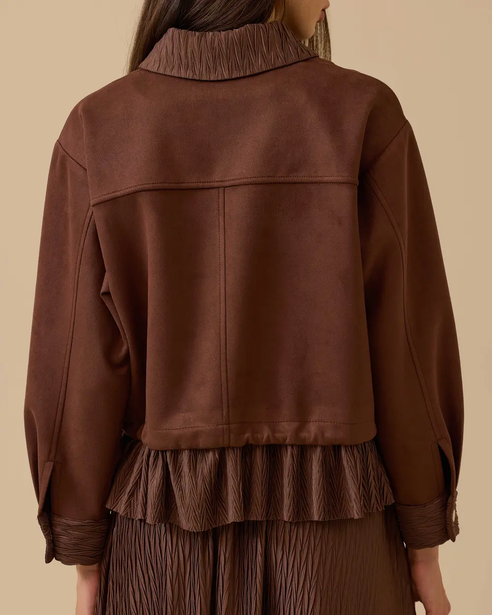 توفر هذه السترة المصنوعة من جلد الغزال والمزينة بالكشكشة الأناقة والراحة بفضل تصميمها الأنيق وملمسها الناعم.