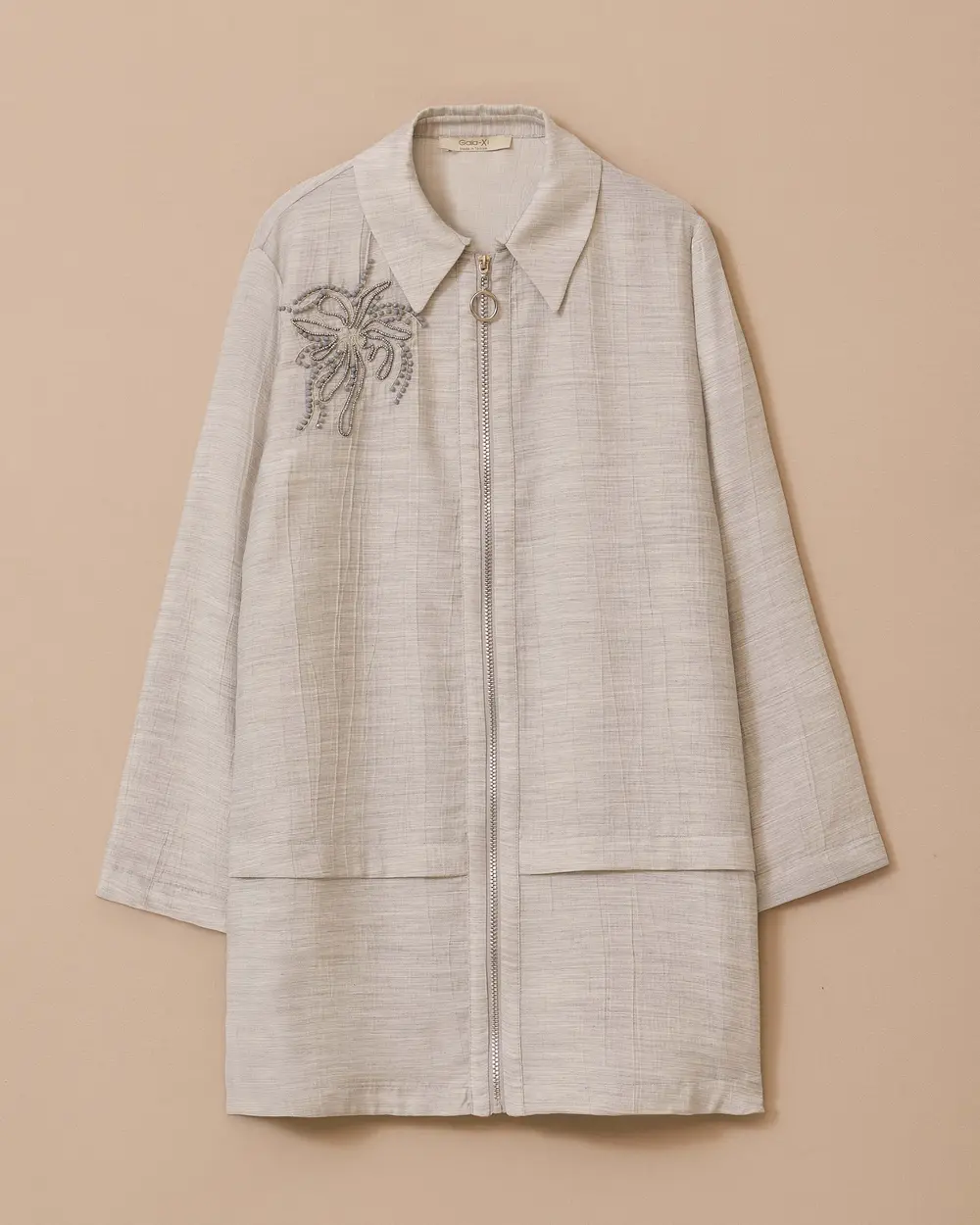 يضفي هذا المعطف المطرز ذو السحاب الأمامي والمقاس الكبير لمسة عصرية على الأسلوب اليومي بفضل مقاسه المريح وتفاصيله الأنيقة.