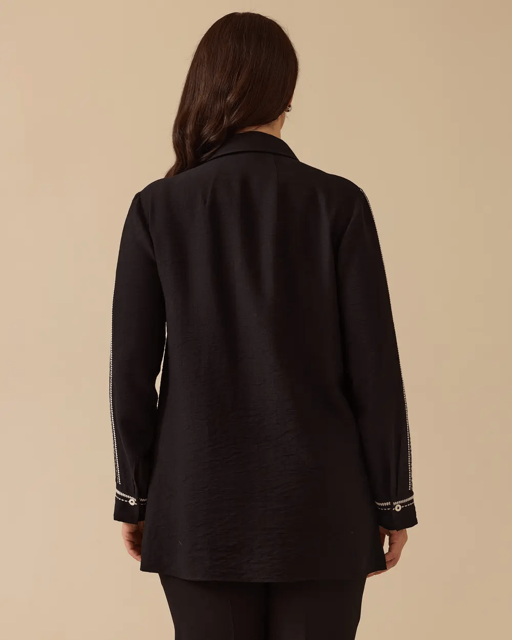 يُضفي هذا القميص ذو المقاسات الكبيرة والمُزيّن بخطوط أنيقة لمسةً من الرقي، بينما يُوفر قصته المريحة راحةً فائقة. إنه خيار مثالي لإطلالات يومية وأخرى خاصة.