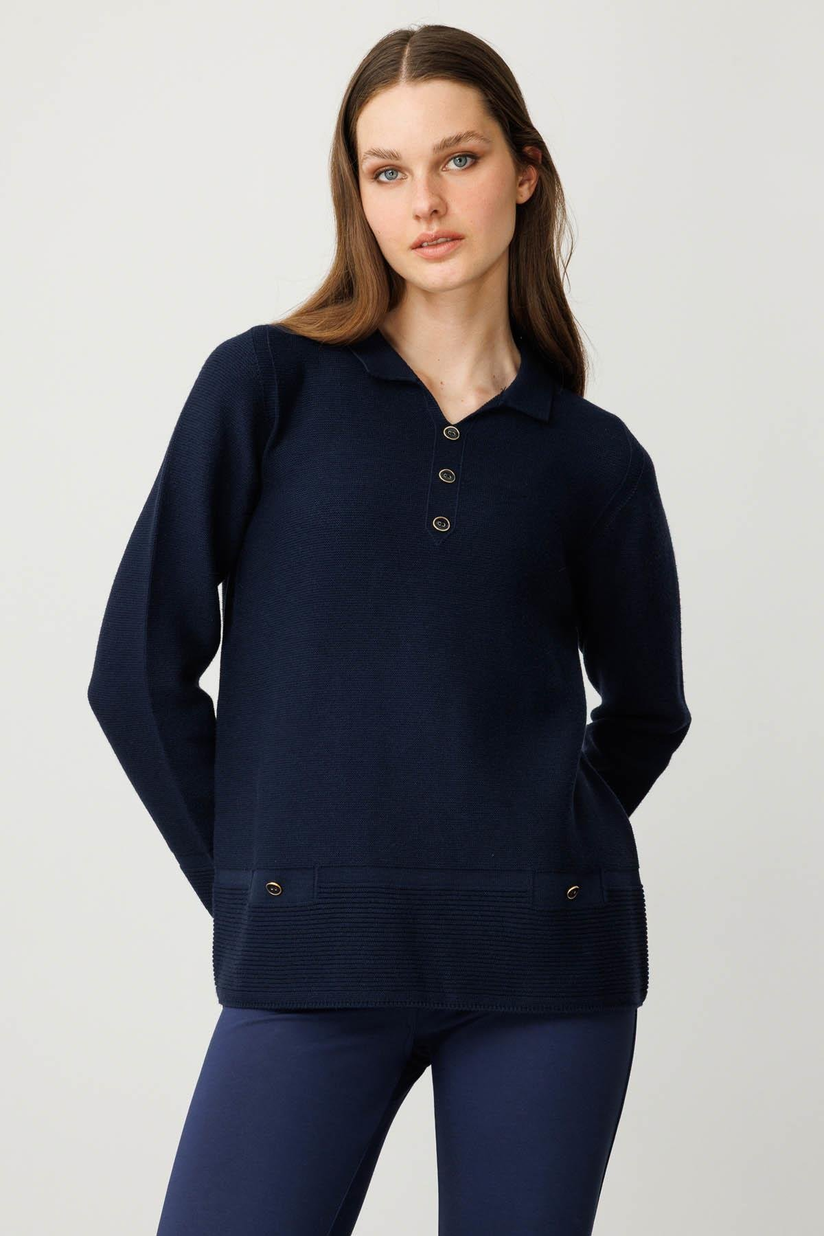 بلوزة نسائية بياقة بولو ونقشة جيوب وهمية
