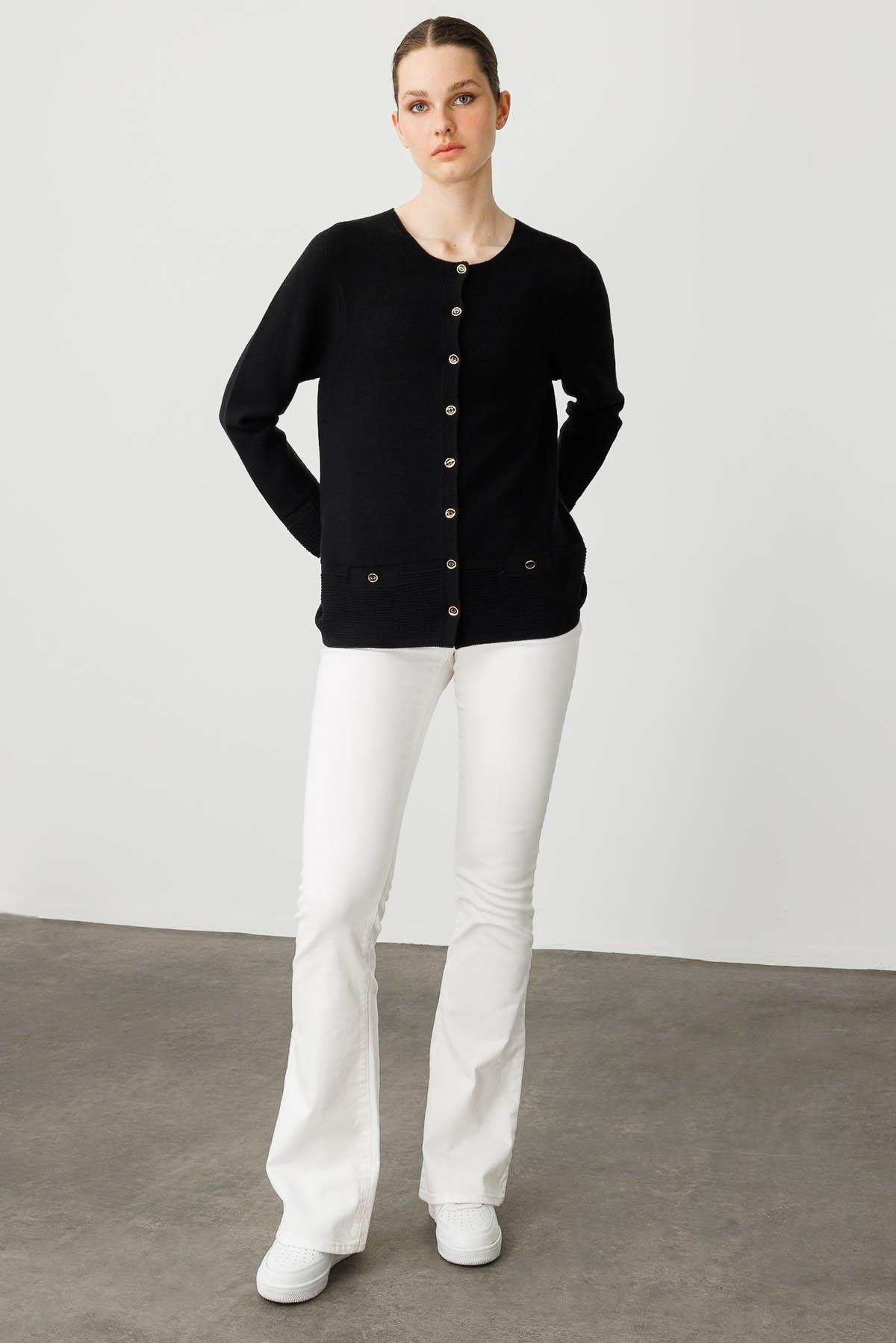 كارديجان نسائي برقبة دائرية مع جيوب وأزرار وهمية - بنقوش
