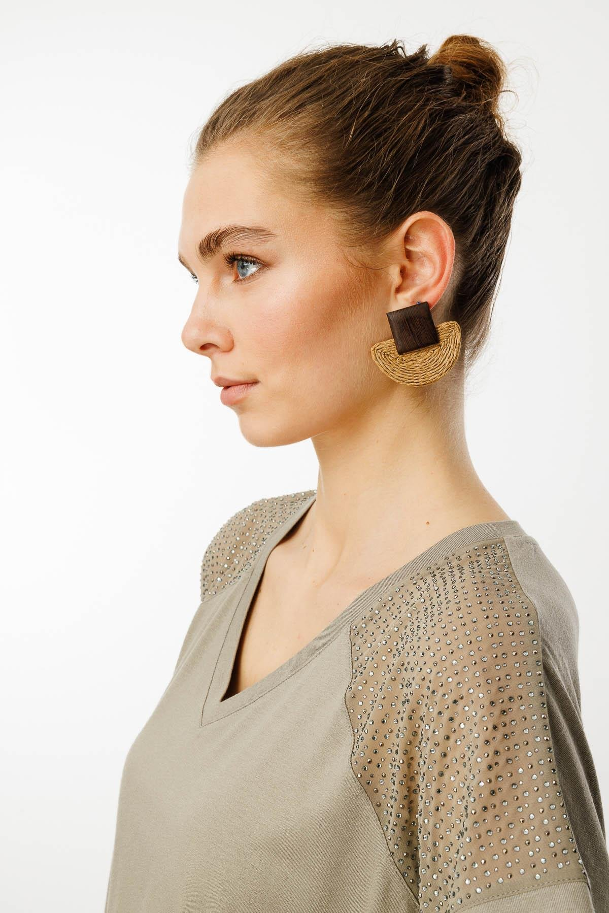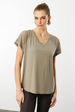 تيشيرت قطني نسائي بياقة على شكل حرف V وطبعة حجر على الكتفين