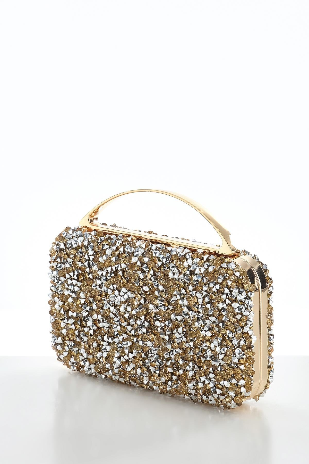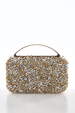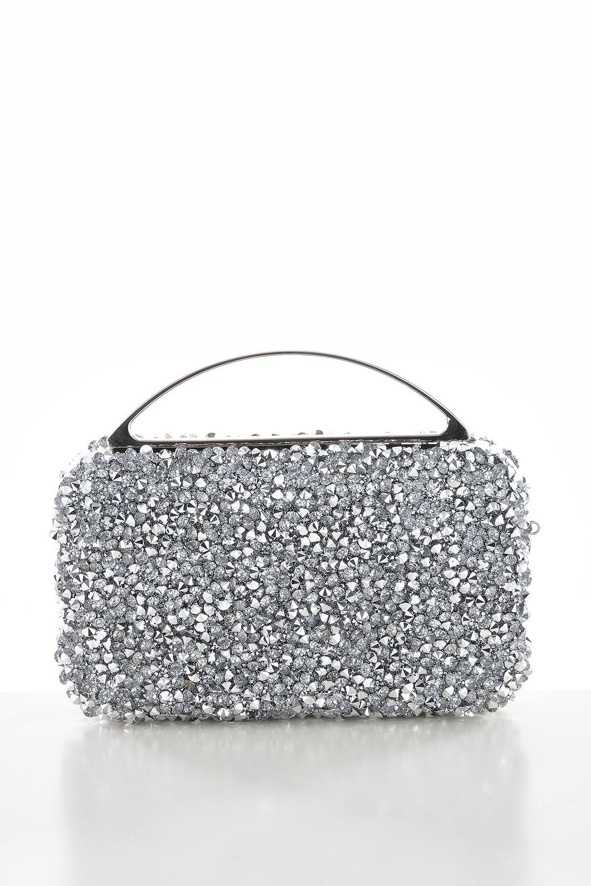 حقيبة يد أنيقة مزينة بالكريستال وحزام سلسلة، مناسبة للسهرات.
