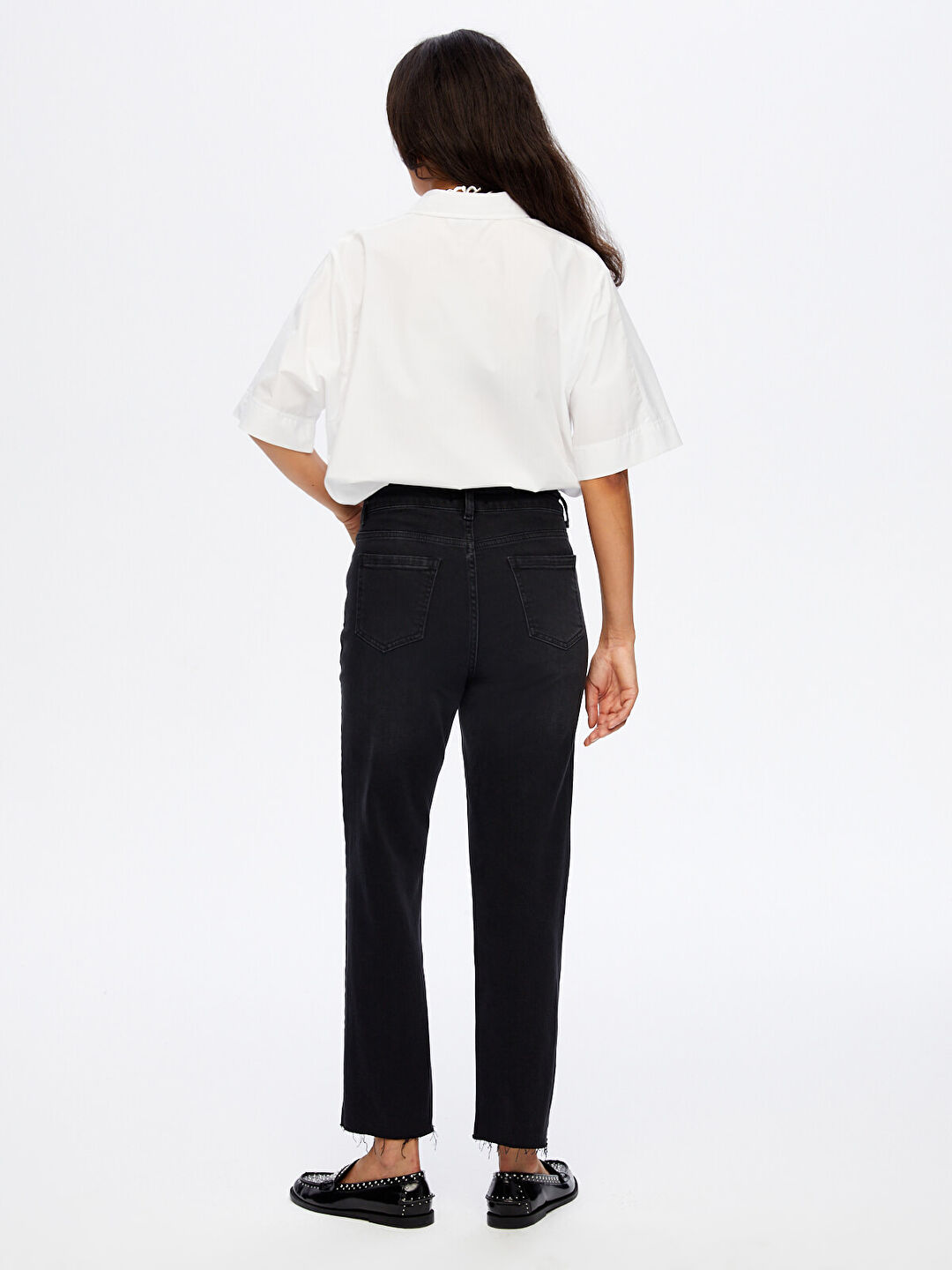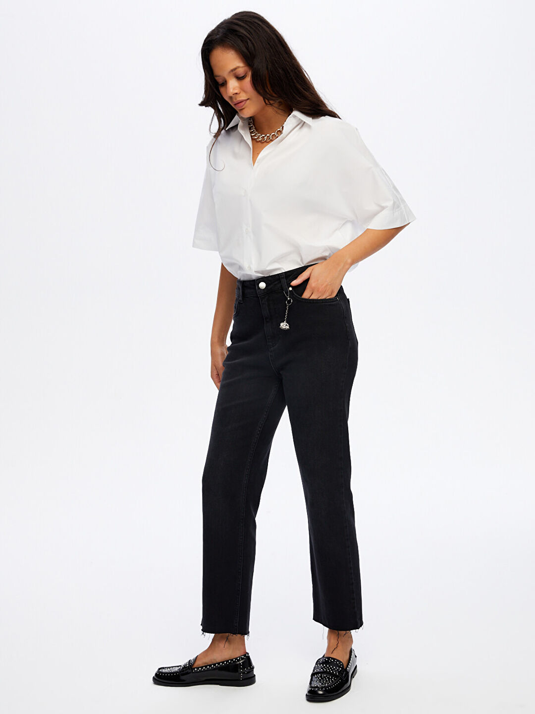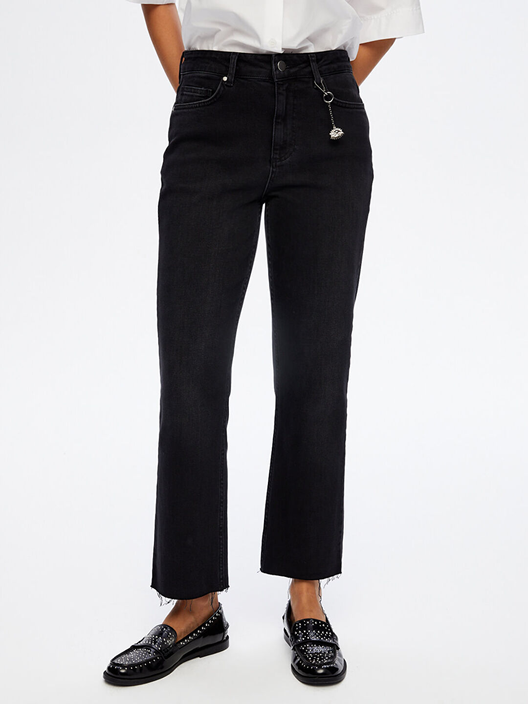اسم المنتج: بنطال جينز بقصة مستقيمة مزين بإكسسوارات معدنية W26JPN009