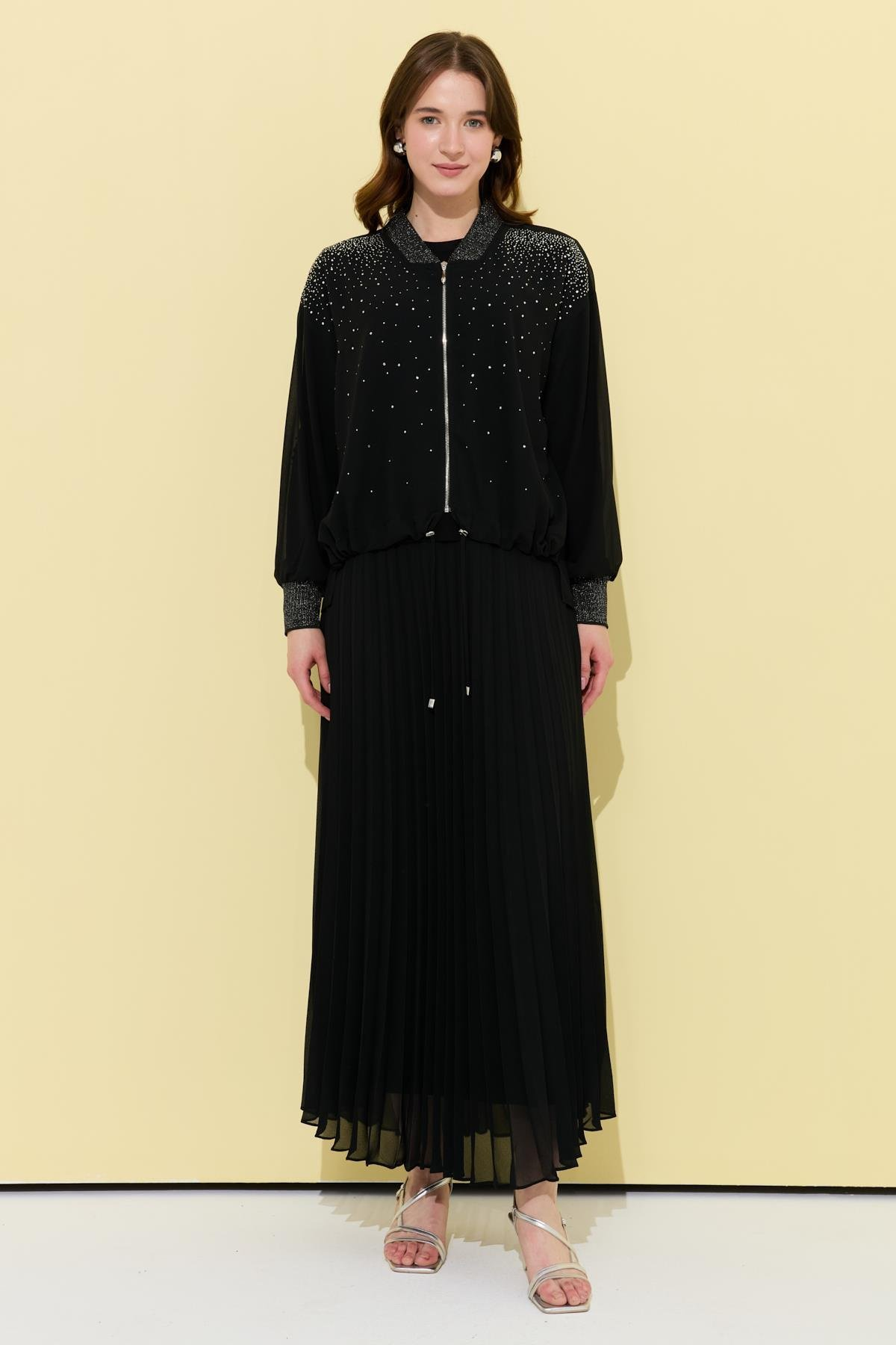 طقم تنورة من قماش الشيفون المنسوج، بتفاصيل حياكة مضلعة وأحجار مزخرفة، وسحاب أمامي، وخصر مطاطي، وقصة واسعة، طول الجاكيت: 60 سم، طول التنورة: 90 سم