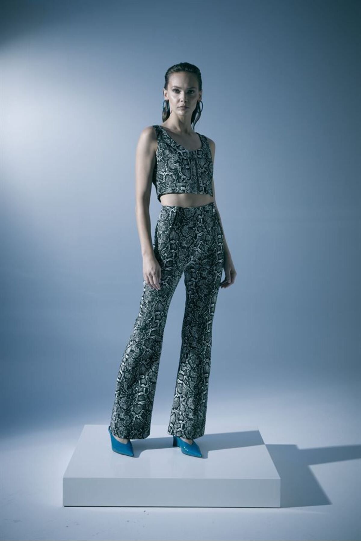 قياسات العارضة: الوزن: 52 كجم / الطول: 1.73 سم / الصدر: 86 سم / الخصر: 65 سم / الأرداف: 92 سم / المقاس: صغير تركيبة القماش: 100% بوليستر؛