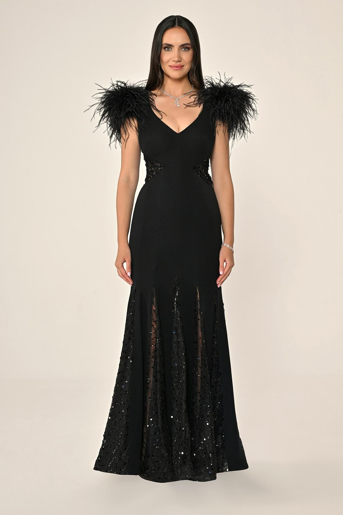 فستان سهرة طويل محبوك مزين بريش النعام على الكتفين، وخصر وظهر وحافة مطرزة بالترتر.