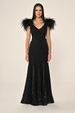 فستان سهرة طويل محبوك مزين بريش النعام على الكتفين، وخصر وظهر وحافة مزينة بالترتر.