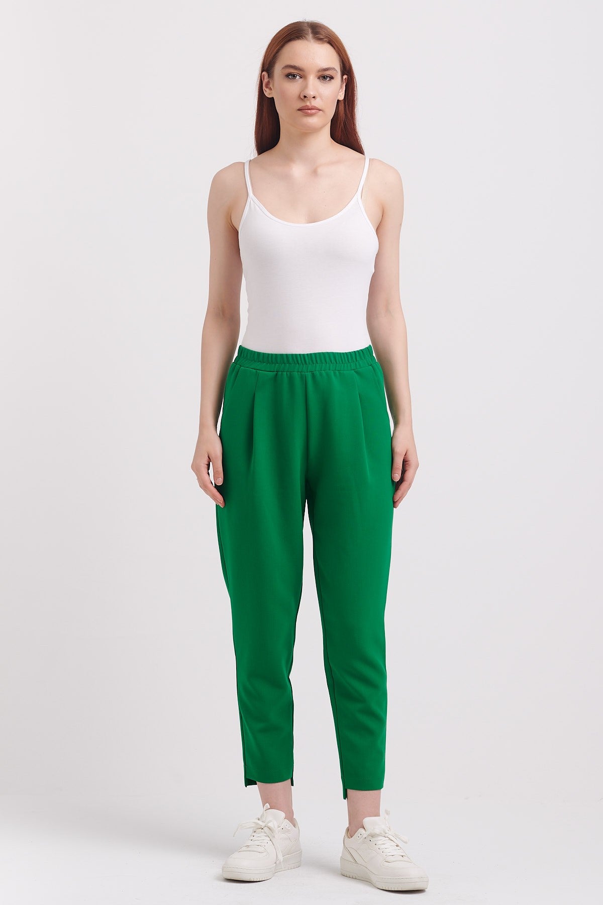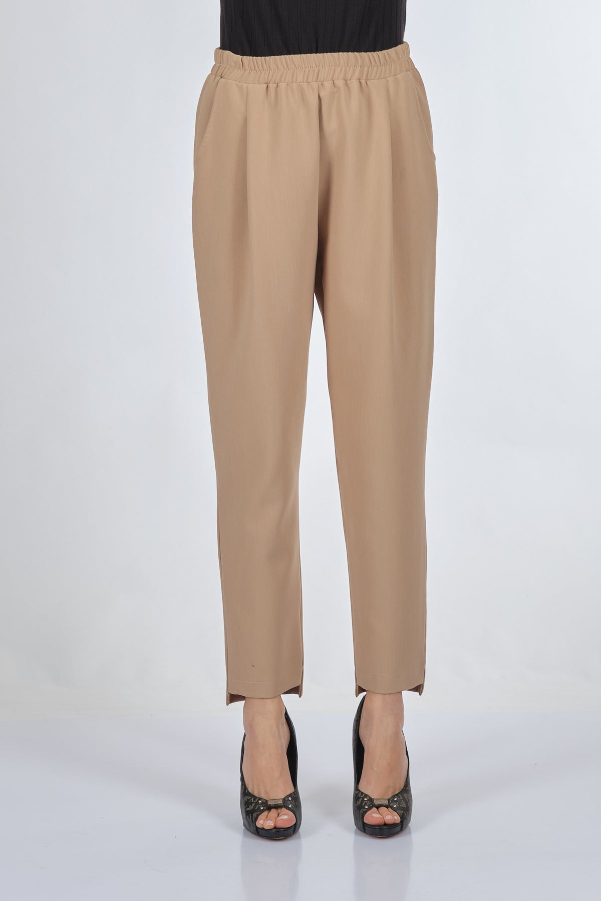 ميزات المنتج: خصر مطاطي، جيوب جانبية، ثنيات أمامية، ساق أمامية قصيرة، ساق خلفية طويلة. مقاس المنتج: مقاس عادي. سماكة المنتج: متوسطة. طول المنتج: 98 سم. تركيبة القماش: 72% بوليستر، 22% فيسكوز، 6% إيلاستومر. موسم المنتج: الخريف/الشتاء. قياسات العارضة: مقاس العينة: S. طول العارضة: 176 سم. قياسات العارضة: 84/61/89