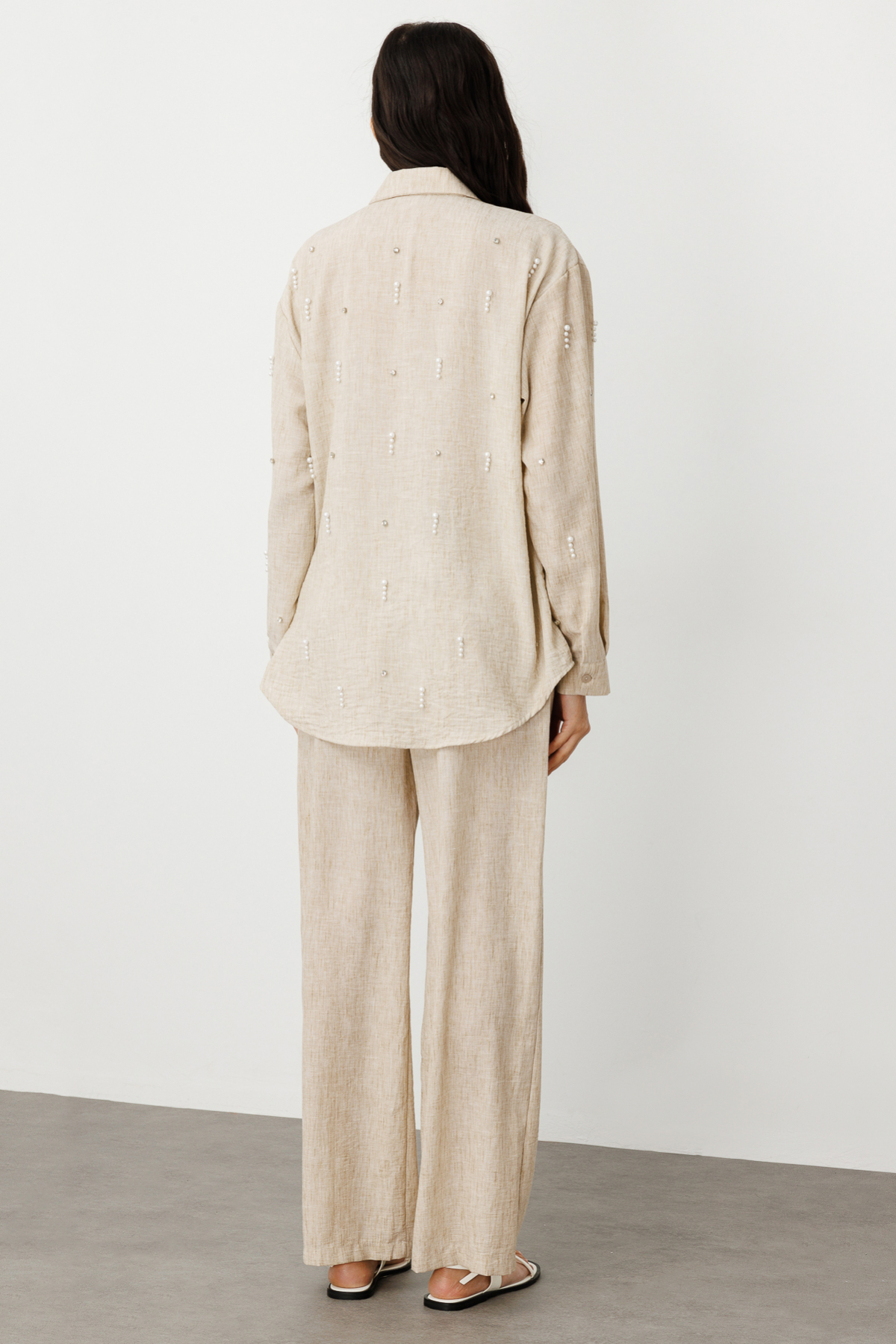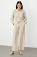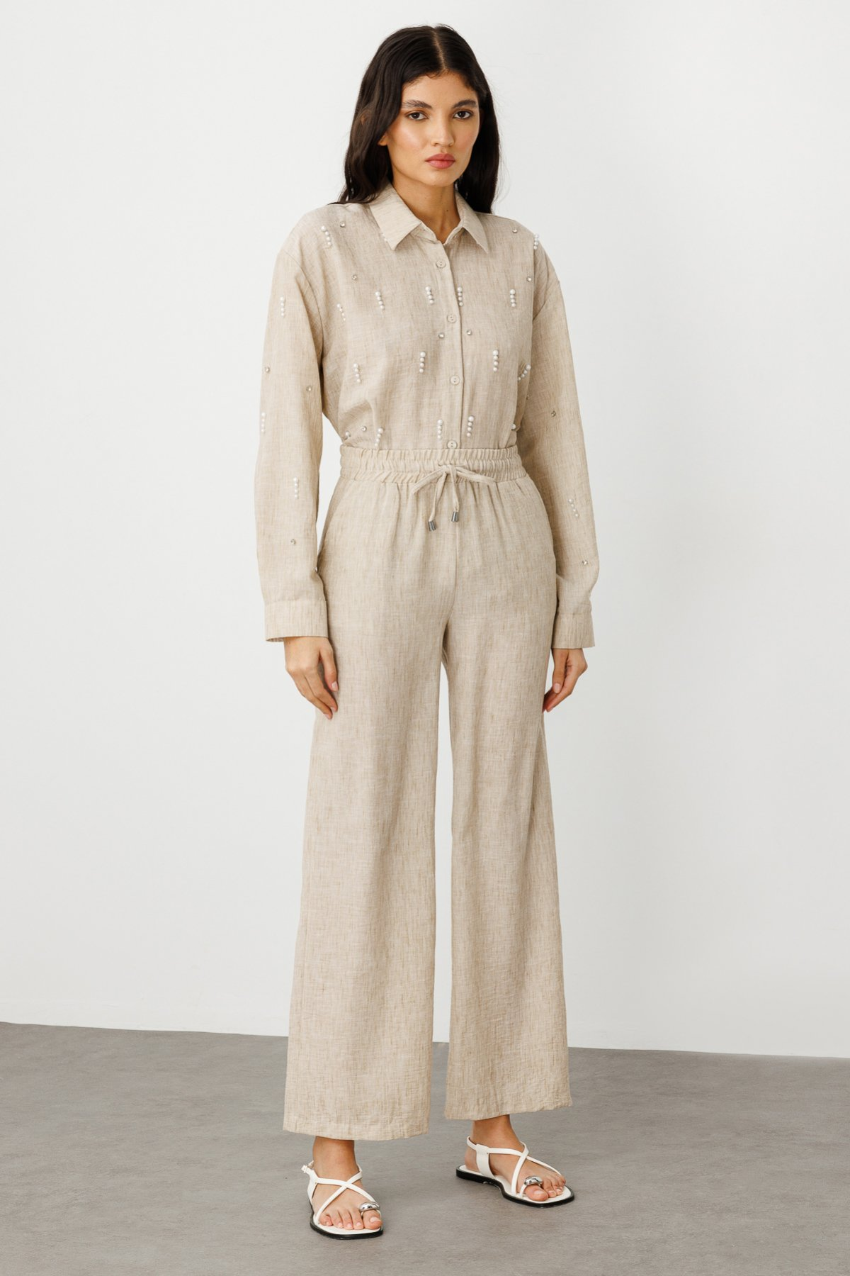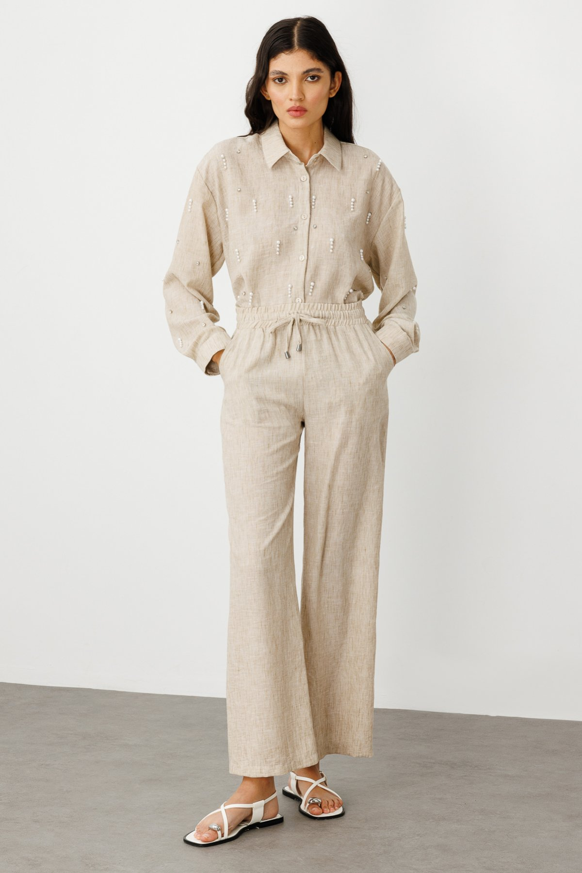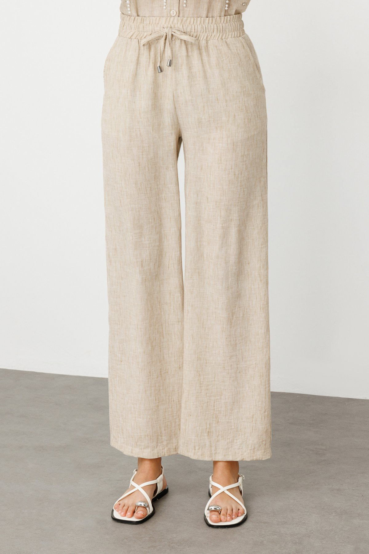 مواصفات المنتج: خصر مطاطي، رباط، أرجل واسعة، قماش كتان، جيوب جانبية.