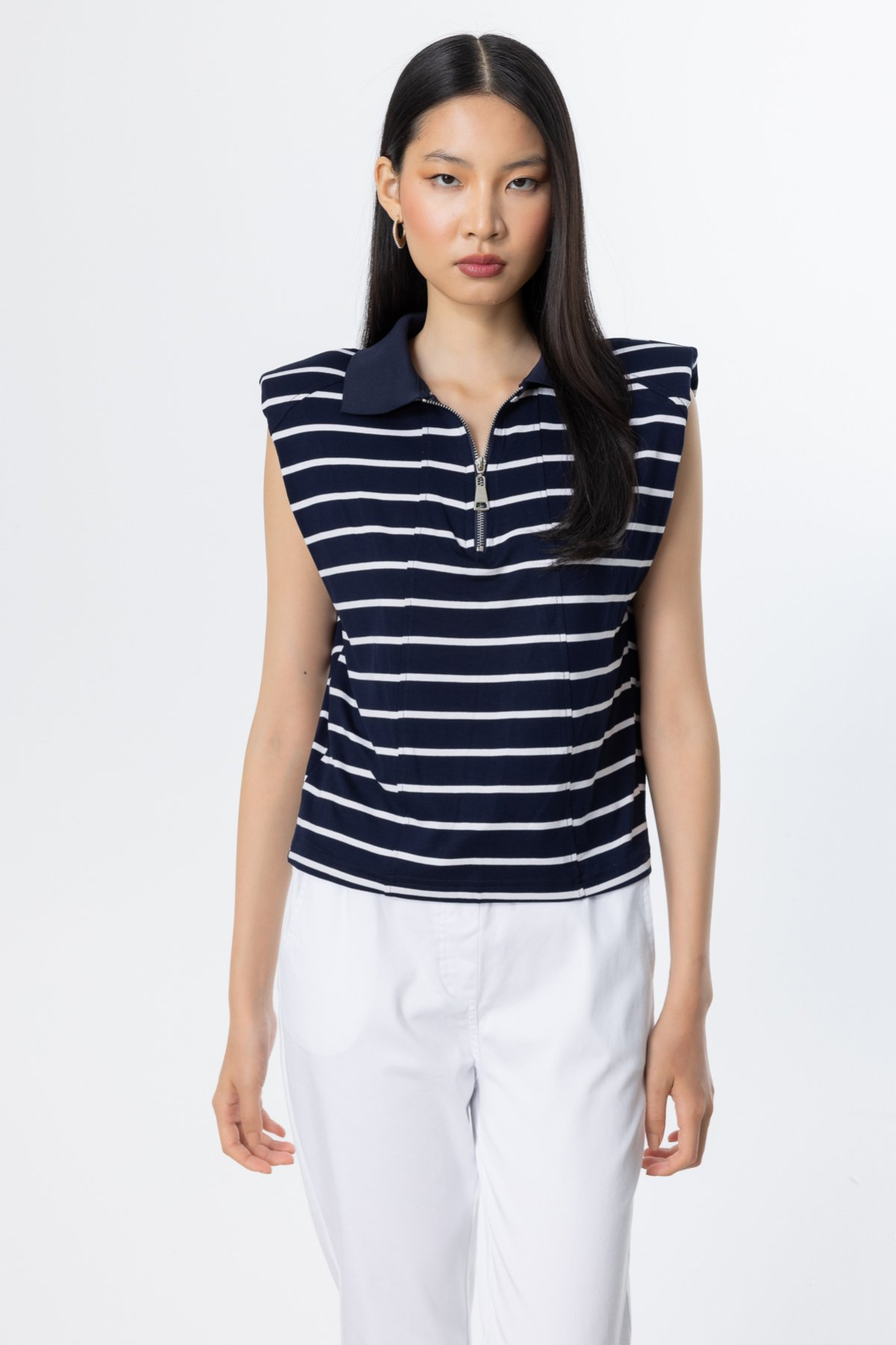 بلوزة قصيرة بدون أكمام بياقة بولو مخططة بتصميم بسيط - طقم صيفي كاجوال