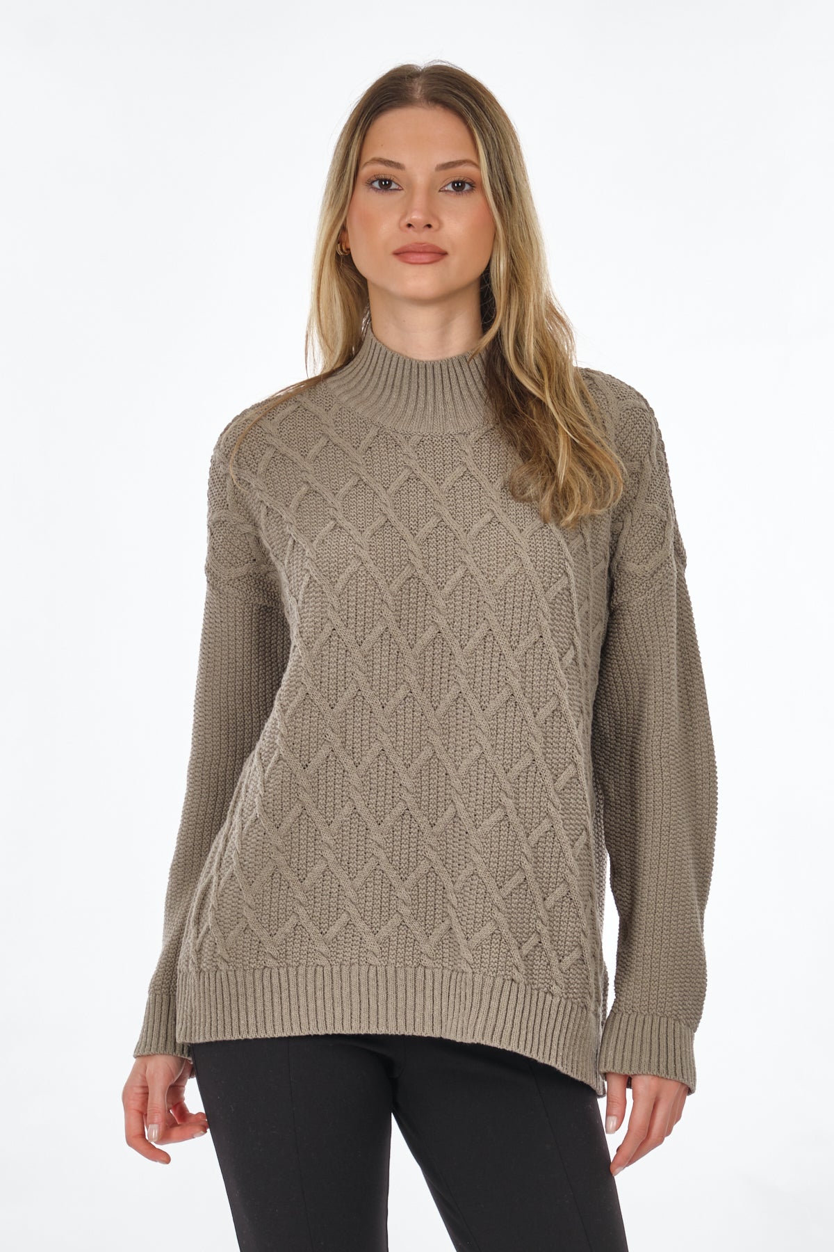 - نوع المنتج: كنزة؛ - فتحة الرقبة: نصف عالية؛ - الأكمام: طويلة؛ الجنس: نسائي؛ الخامة: حياكة سادة؛ التركيب: 70% قطن معاد تدويره، 30% بوليستر؛ هذا المنتج مصنوع من القطن المعاد تدويره. يساهم القطن المعاد تدويره في الحفاظ على الموارد الطبيعية والحد من نفايات المنسوجات.
