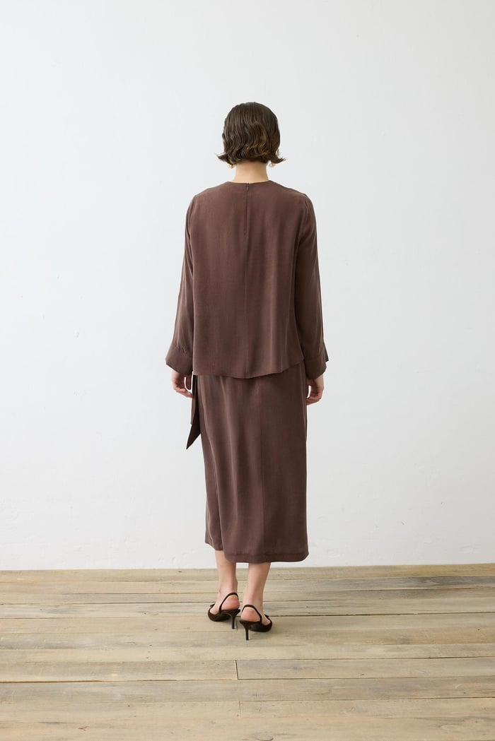 طقم تنورة ملفوفة من الحرير المغسول من برايم ستون، متوفر لدى متجر الخياطة.