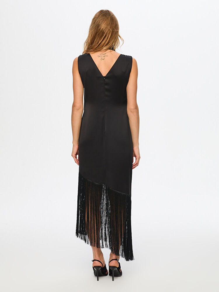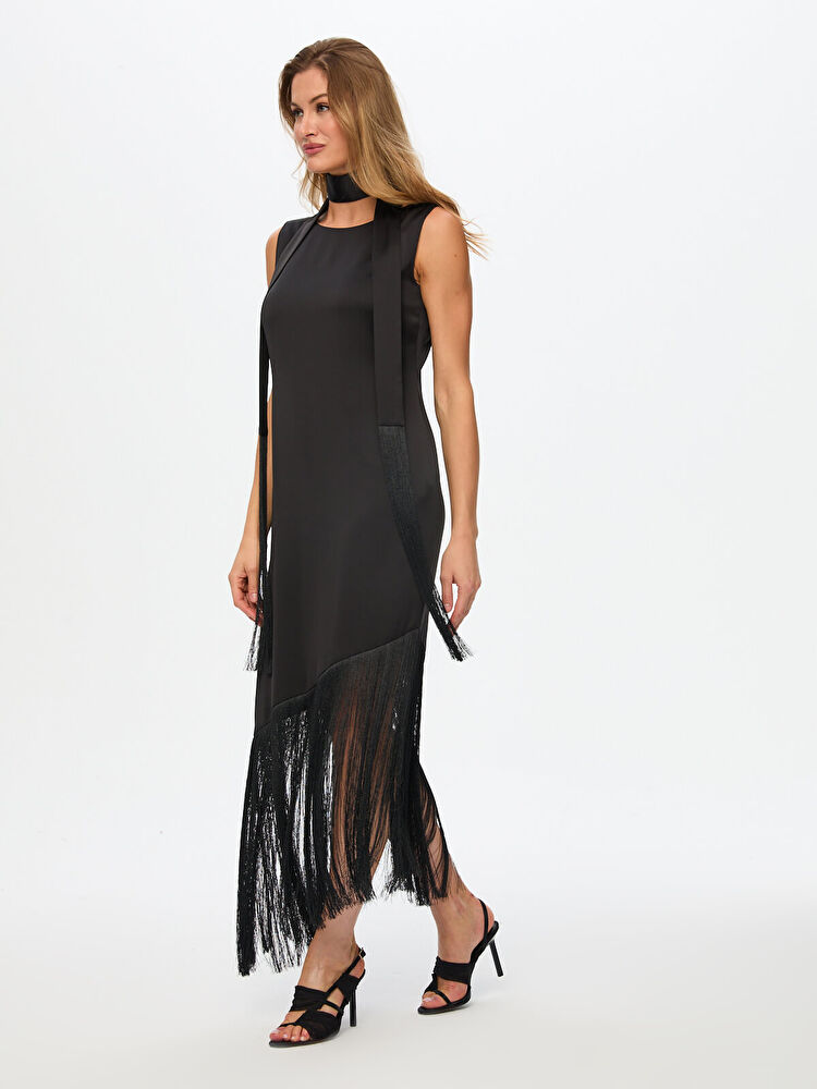 فستان سهرة من الكريب بدون أكمام بتنورة مزينة بشرابات ووشاح من تصميم فائق سونميز