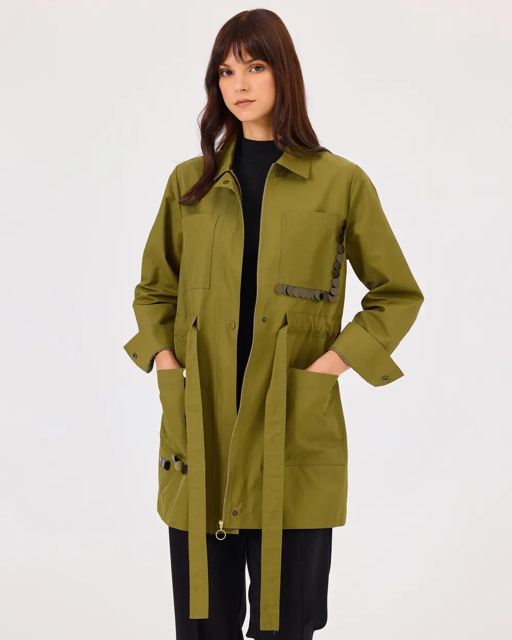 يوفر هذا المعطف الطويل المزود بحزام وتفاصيل من الترتر وسحاب استخدامًا عمليًا بفضل جيوبه وتصميمه المزود بأزرار كبس، بينما يكمل ربط الحزام وتفاصيل الترتر مظهره الأنيق.