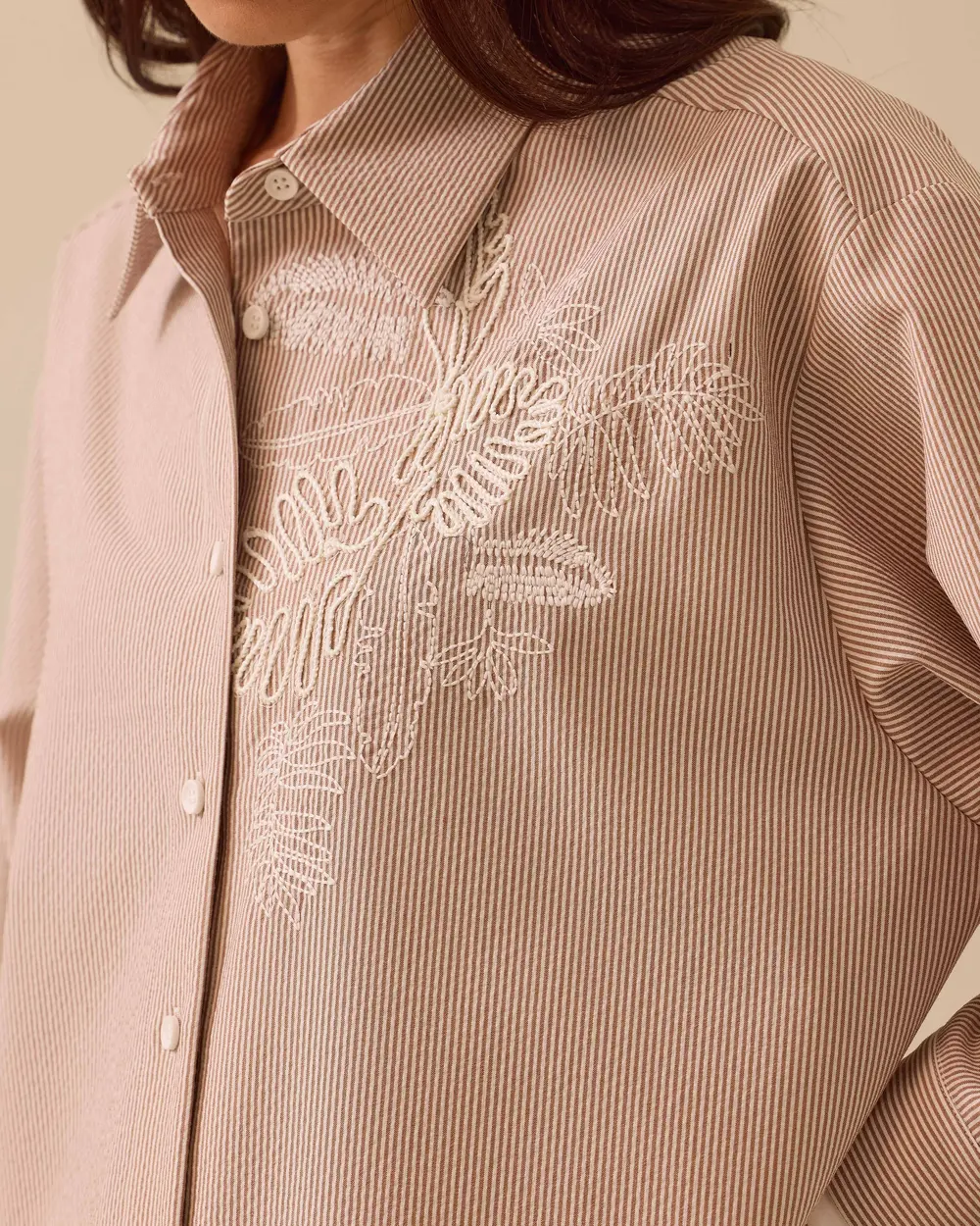 تجمع السترة المخططة المطرزة بين الأناقة البسيطة والخطوط الرقيقة والتطريز الرائع.