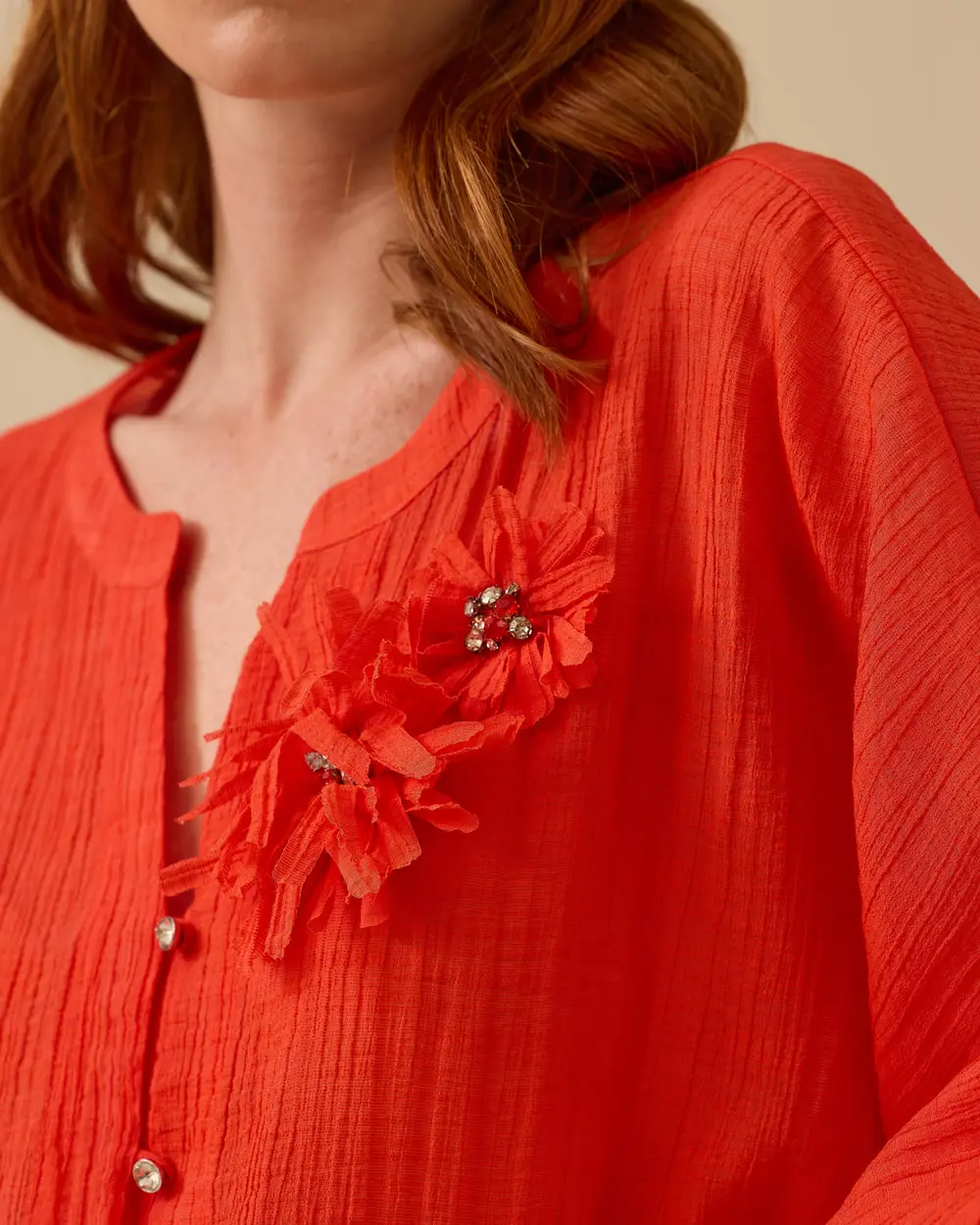 يتميز قميص البالون ذو الأزرار الأمامية والإكسسوارات الزهرية بمظهر أنيق وعصري بفضل تصميمه ذي الأكمام القابلة للفصل وتفاصيله الزهرية.
