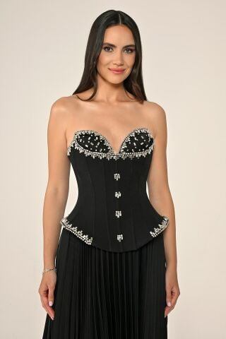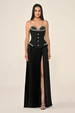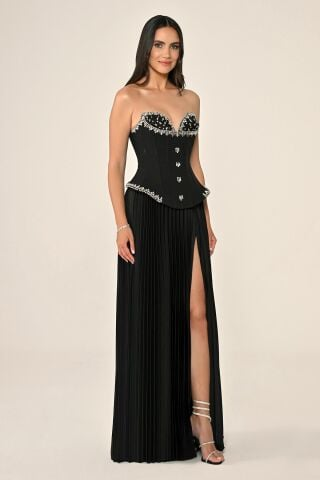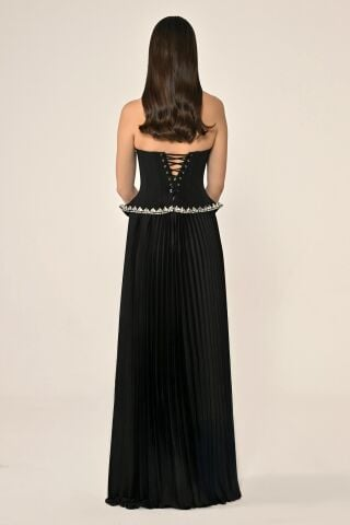 فستان سهرة طويل من ألفابيتا، بدون حمالات، بلوزة من الكريب مزينة وتنورة من الساتان مطوية
