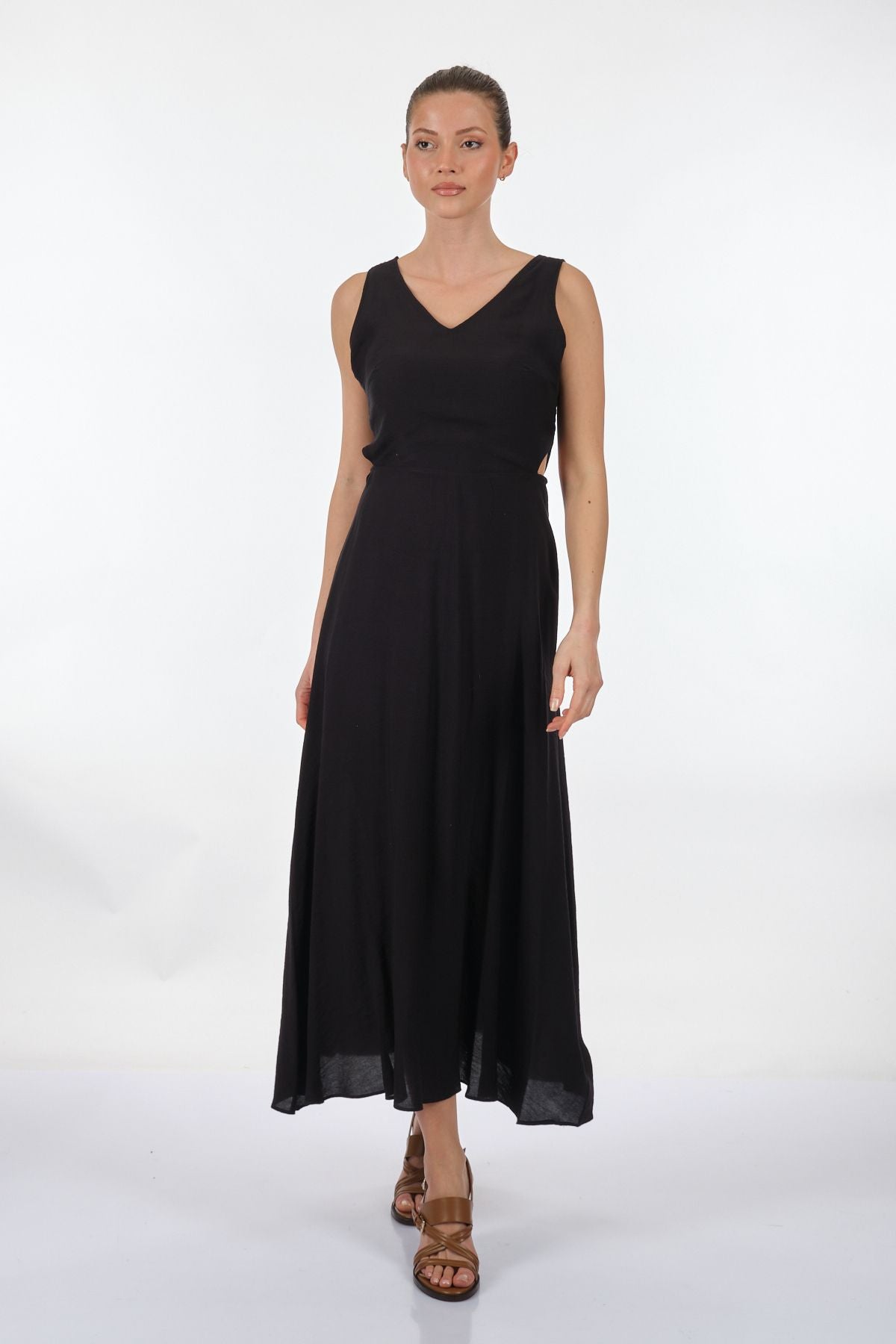 قياسات العارضة: الوزن: 52 كجم / الطول: 1.73 سم / الصدر: 86 سم / الخصر: 65 سم / الوركين: 92 سم / المقاس: صغير تركيبة النسيج: 90% فيسكوز 10% نايلون؛