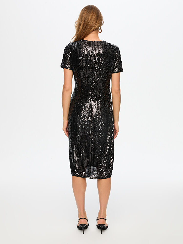 فستان سهرة قصير الأكمام بياقة على شكل حرف V مزين بالترتر من تصميم فائق سونميز