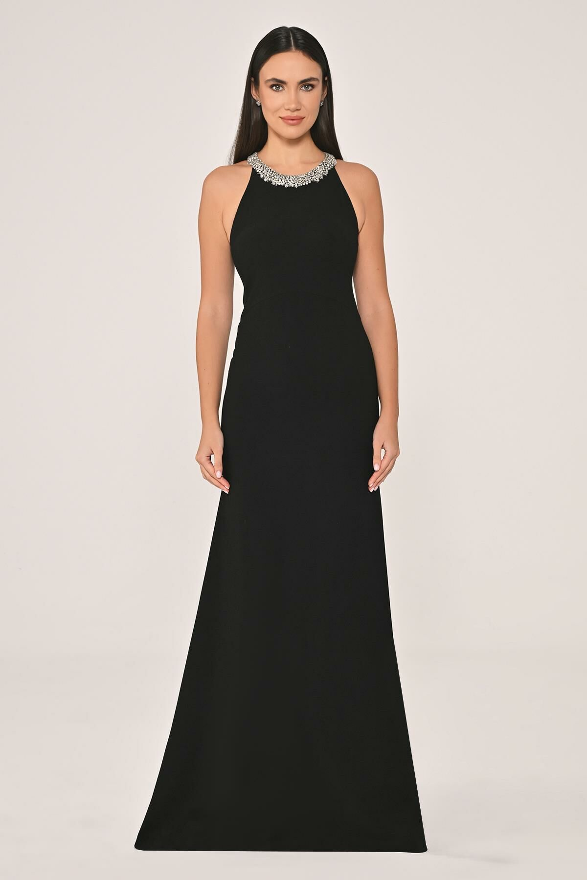 فستان طويل من الكريب مع إكسسوارات على خط العنق والظهر