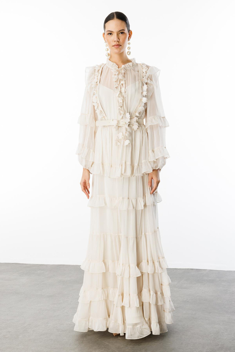 فستان نيفيلي ماكسي شيفون بتفاصيل كشكشة على خط العنق