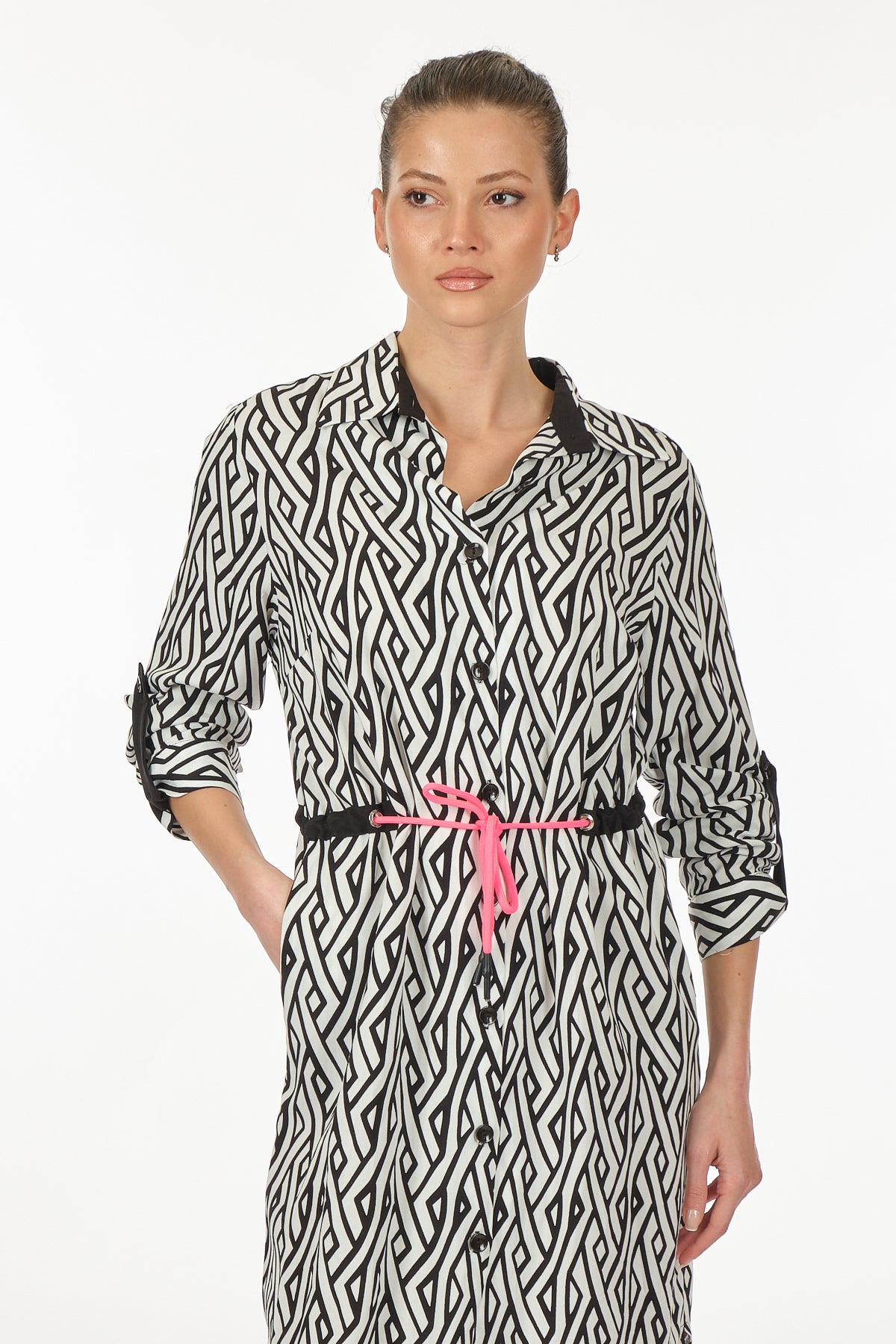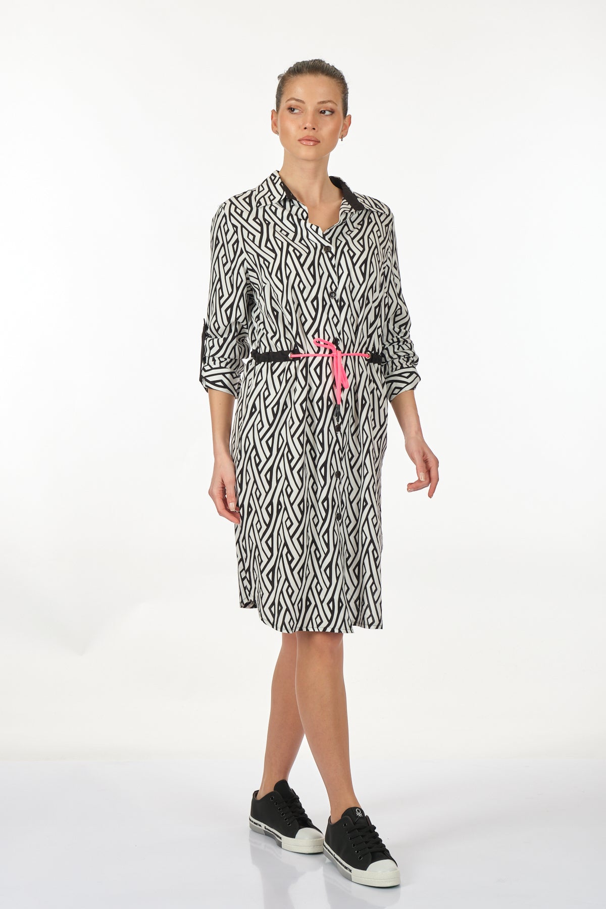 فستان ميدي كاجوال بأكمام طويلة بنقشة هندسية من Ysatis - قصة مريحة