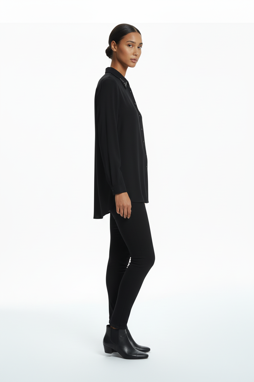 Bağlama Detaylı Taş İşlemeli Gömlek, zarif yaka süslemeleri ve modern tasarımıyla şıklık sunar.